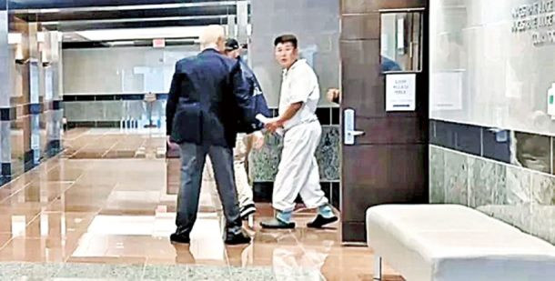 孫耀寧日前出庭時,穿一身白色囚衣、戴著手銬和腳鐐。讀者提供