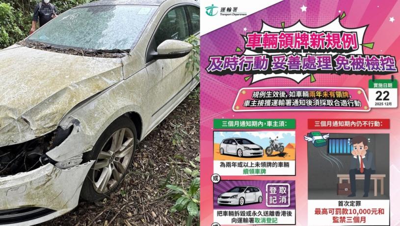 車輛領牌新規例於12月22日起實施,運輸署在社交平台發文,指棄置車輛不僅影響市容,更對環境造成負擔。新制度實施後,署方會向兩年或以上未領牌車輛的登記車主發出通知,需要在3個月內續領車牌、劏車或永久送離本港後取消登記,如非有實際困難或合理理由申請豁免,即屬犯罪。車主需留意名下車輛的牌照狀況,確保完成登記及領牌手續。