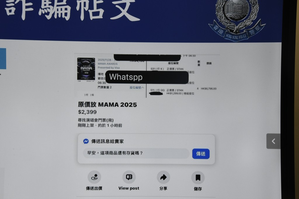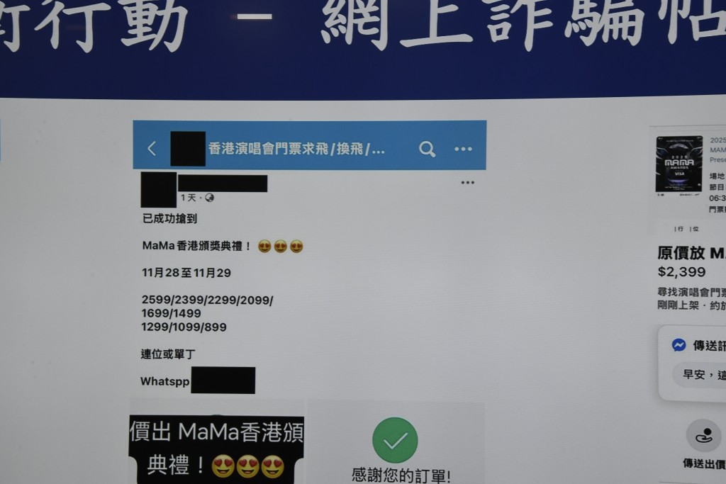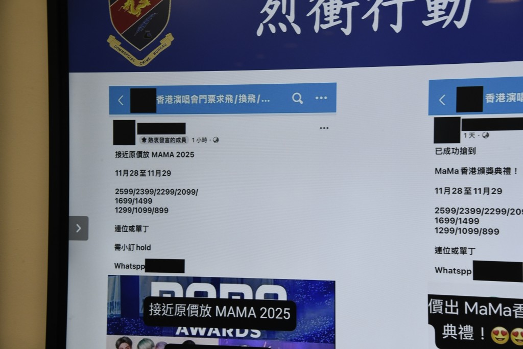 近年多項國際級賽事及歌手樂隊來港比賽或開演唱會,掀起搶票熱嘲,如今年11月的MAMA音樂頒獎禮2025、明年1月的超級女團BLACKPINK,令不法之徒有機可乘,透過不同社交媒體兜售高價黃牛飛,或訛稱代購門票,吸引市民落訂或支付門票全數後,便失聯去如黃鶴。警方收集情報後,昨成功搗破一個本地網上購票詐騙集團。行動中共拘捕3男2女,當中包括集團主腦及數名骨幹成員,成功瓦解一個活躍多月的犯罪團夥,涉案金額超過港幣50萬元。