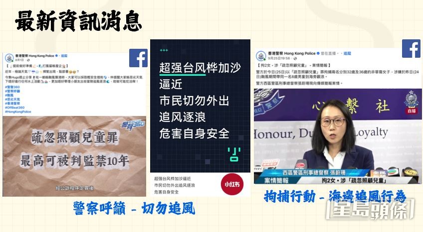 此外,警方亦了解市民生活的實際需求,例如在啟德舉辦大型活動時,平台貼文會詳細展示如何安排入場、離場路線與交通配套,以及週末特定關口人群車輛的排隊情况及相應建議等。以及於超級颱風來臨前和期間提醒網民要小心自身安全。