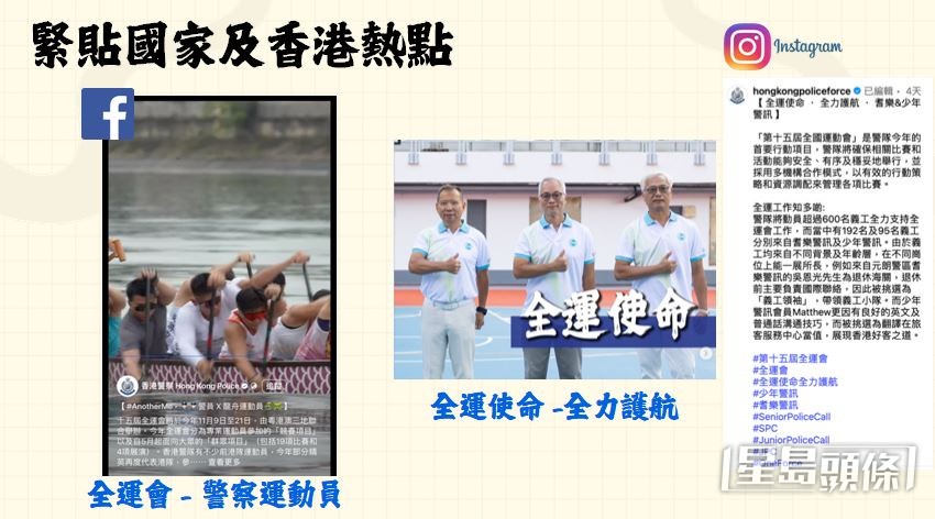 平台亦緊貼國家及香港熱點,例如全運會中警務人員以運動員身份參加全運會:推出AnotherME 系列、群眾比賽防間;「全運使命•全力護航」為主題,以相片貼文方式介紹不同部隊或單位及在賽事期間,警方將有不同安排,或對市民做成影響。警方將適時發方相關資訊,務求盡快通知市民。