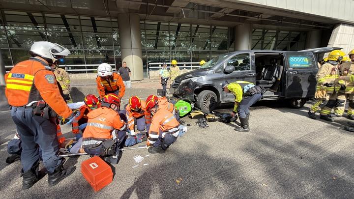 鐵騎士受傷獲救,戴上頸箍送院治理。