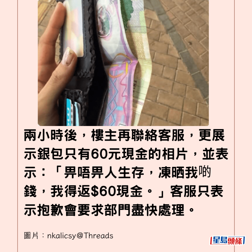 兩小時後,樓主再聯絡客服,更展示銀包只有60元現金的相片,並表示:「畀唔畀人生存,凍晒我啲錢,我得返$60現金。」客服只表示抱歉會要求部門盡快處理。