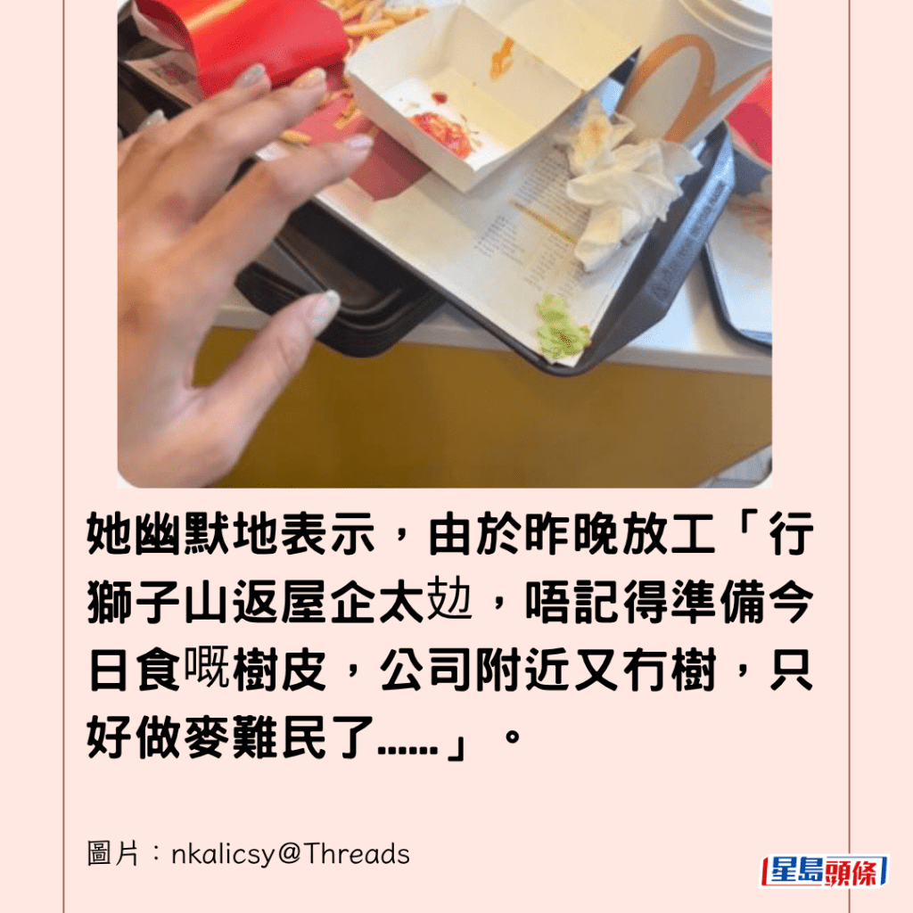 她幽默地表示,由於昨晚放工「行獅子山返屋企太攰,唔記得準備今日食嘅樹皮,公司附近又冇樹,只好做麥難民了……」。