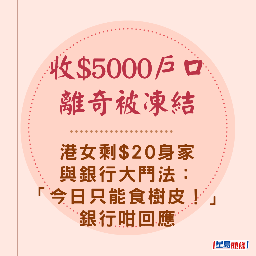 收$5000戶口離奇被凍結 港女剩$20身家與銀行大鬥法:「今日只能食樹皮!」銀行咁回應↓↓↓↓