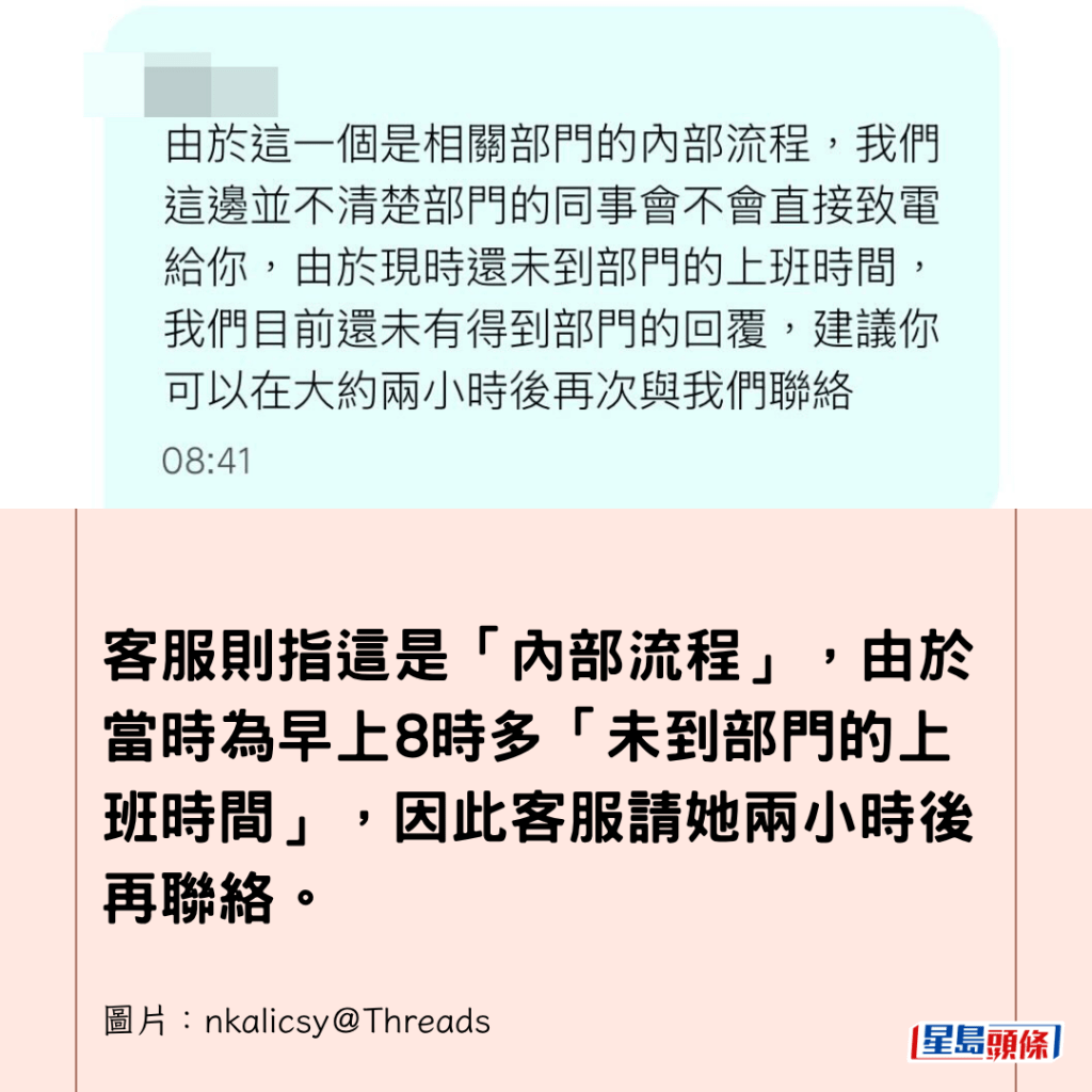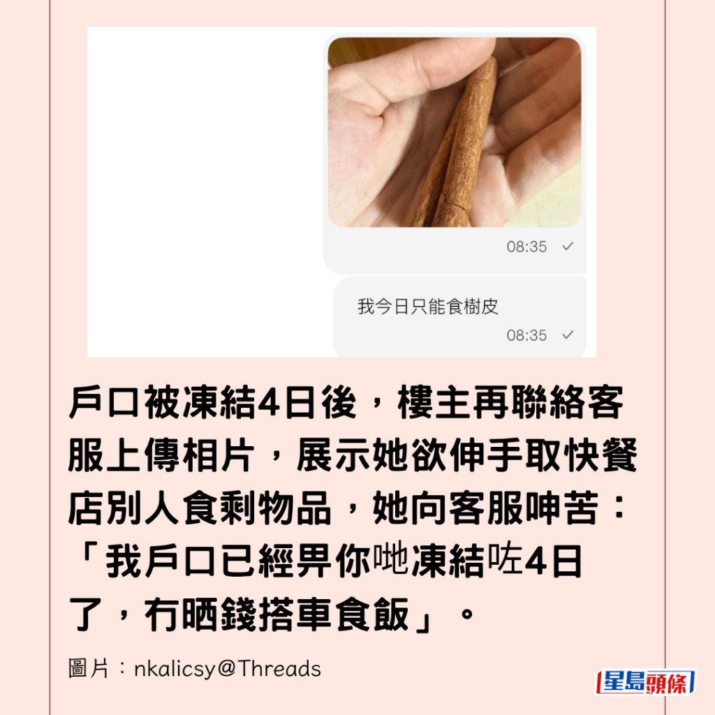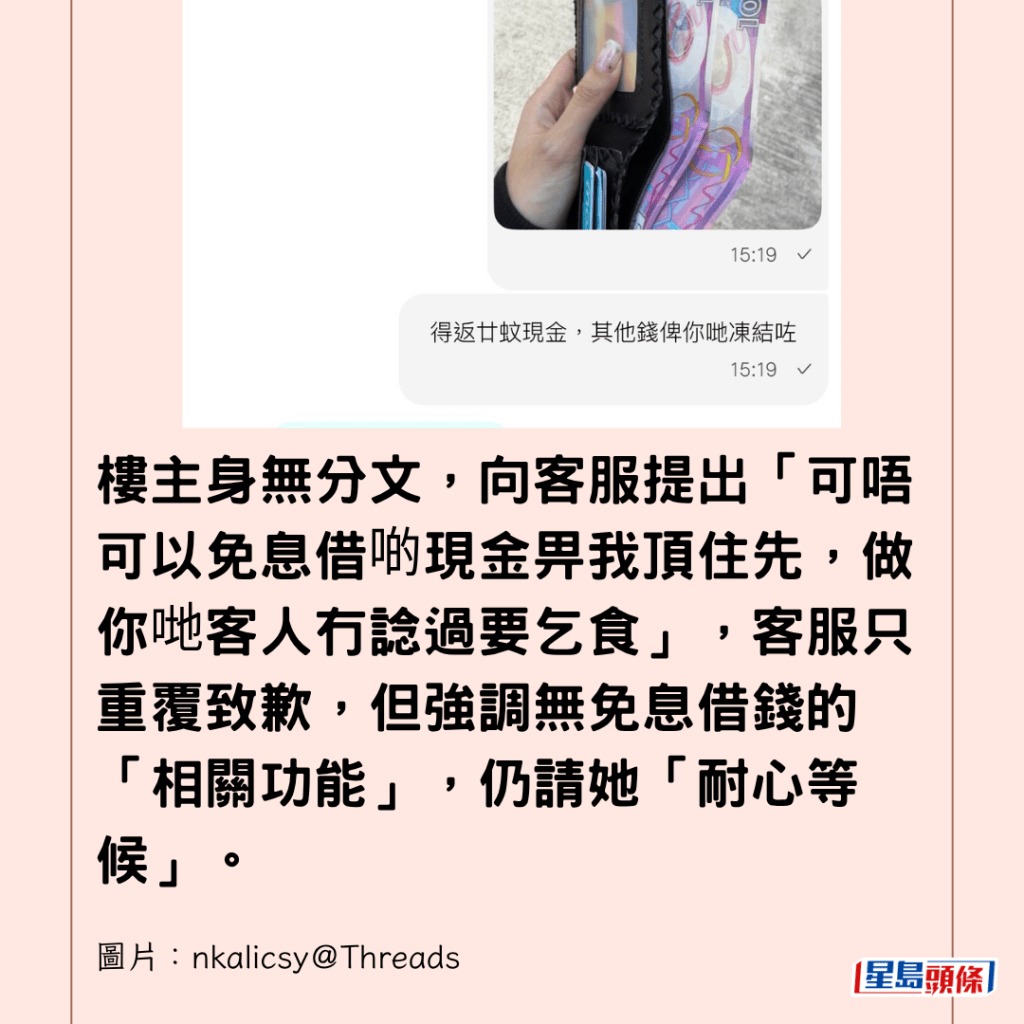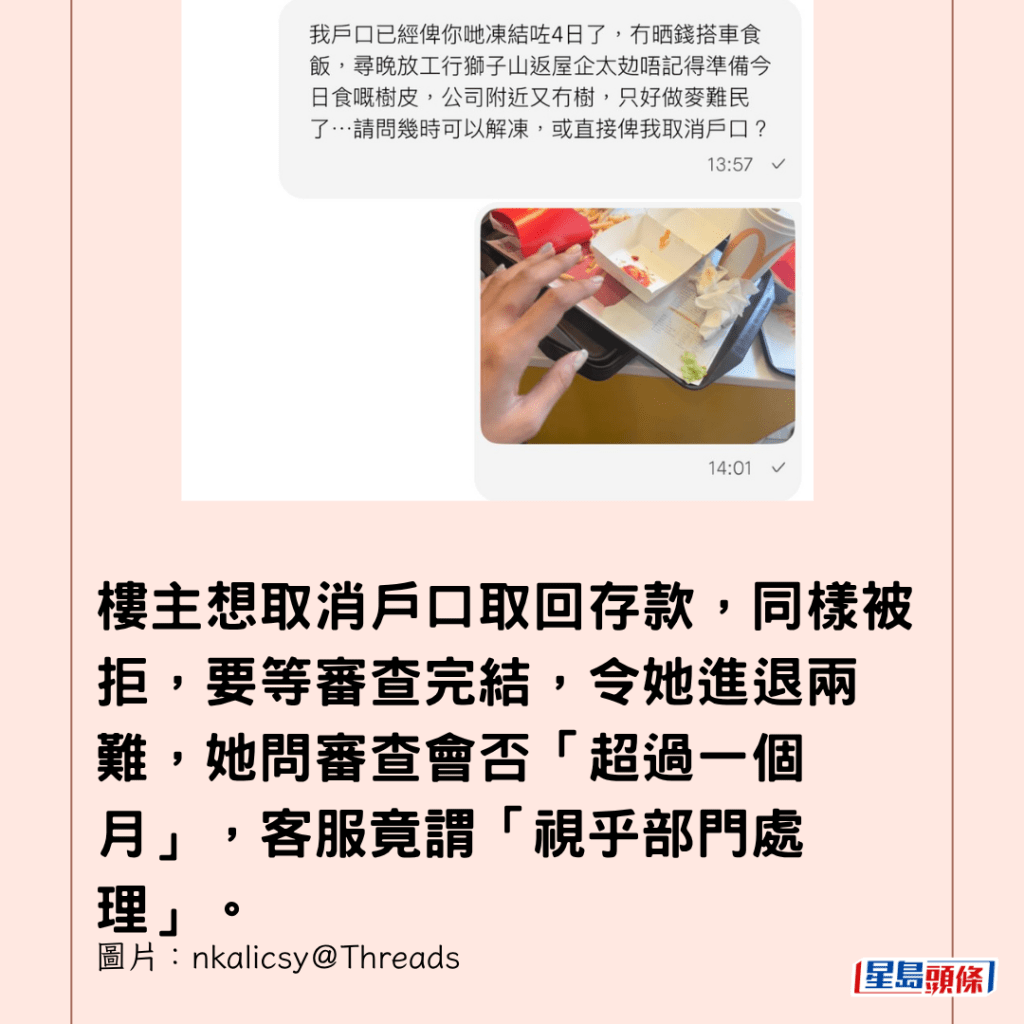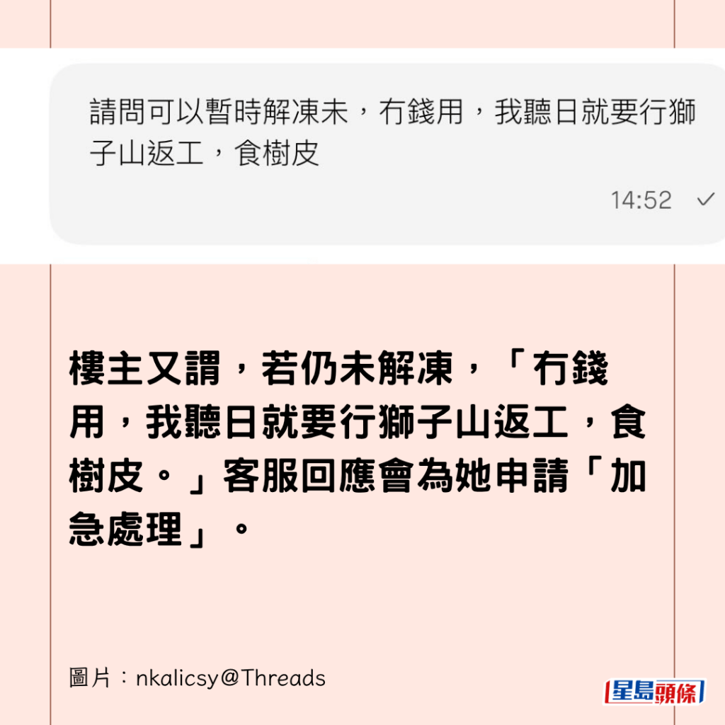 樓主又謂,若仍未解凍,「冇錢用,我聽日就要行獅子山返工,食樹皮。」客服回應會為她申請「加急處理」。