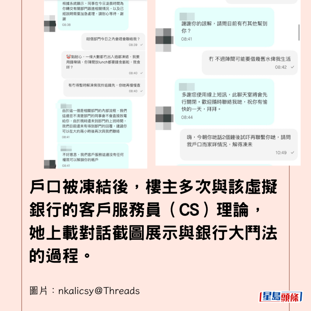 戶口被凍結後,樓主多次與該虛擬銀行的客戶服務員(CS)理論,她上載對話截圖展示與銀行大鬥法的過程。
