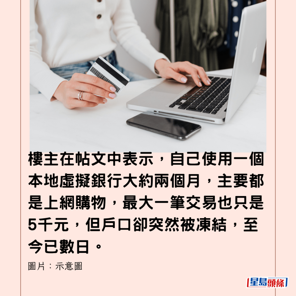 樓主在帖文中表示,自己使用一個本地虛擬銀行大約兩個月,主要都是上網購物,最大一筆交易也只是5千元,但戶口卻突然被凍結,至今已數日。