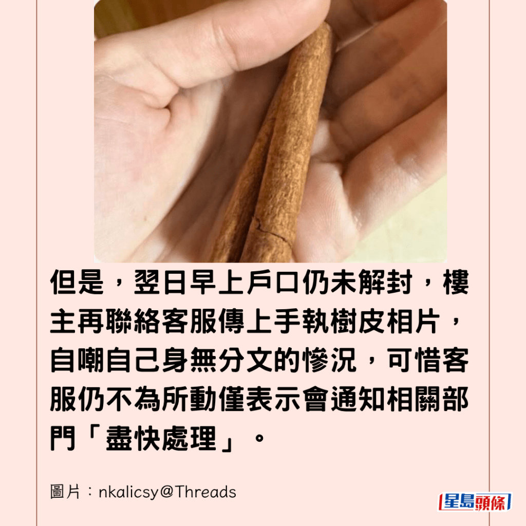 但是,翌日早上戶口仍未解封,樓主再聯絡客服傳上手執樹皮相片,自嘲自己身無分文的慘況,可惜客服仍不為所動僅表示會通知相關部門「盡快處理」。