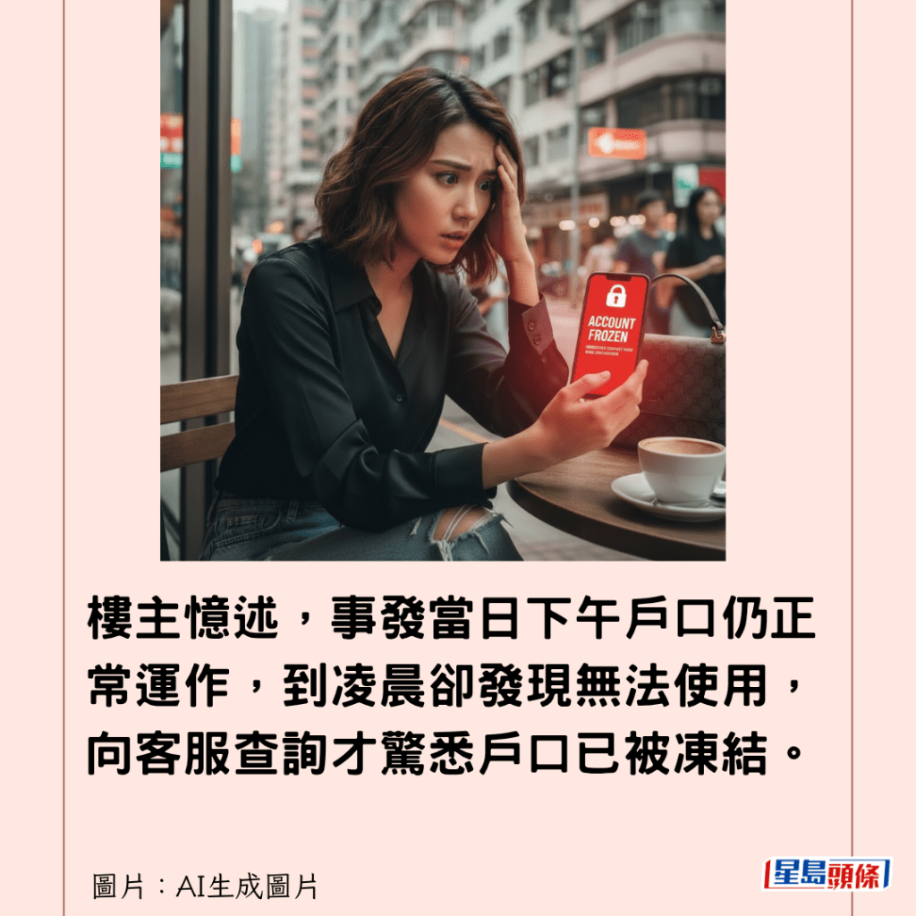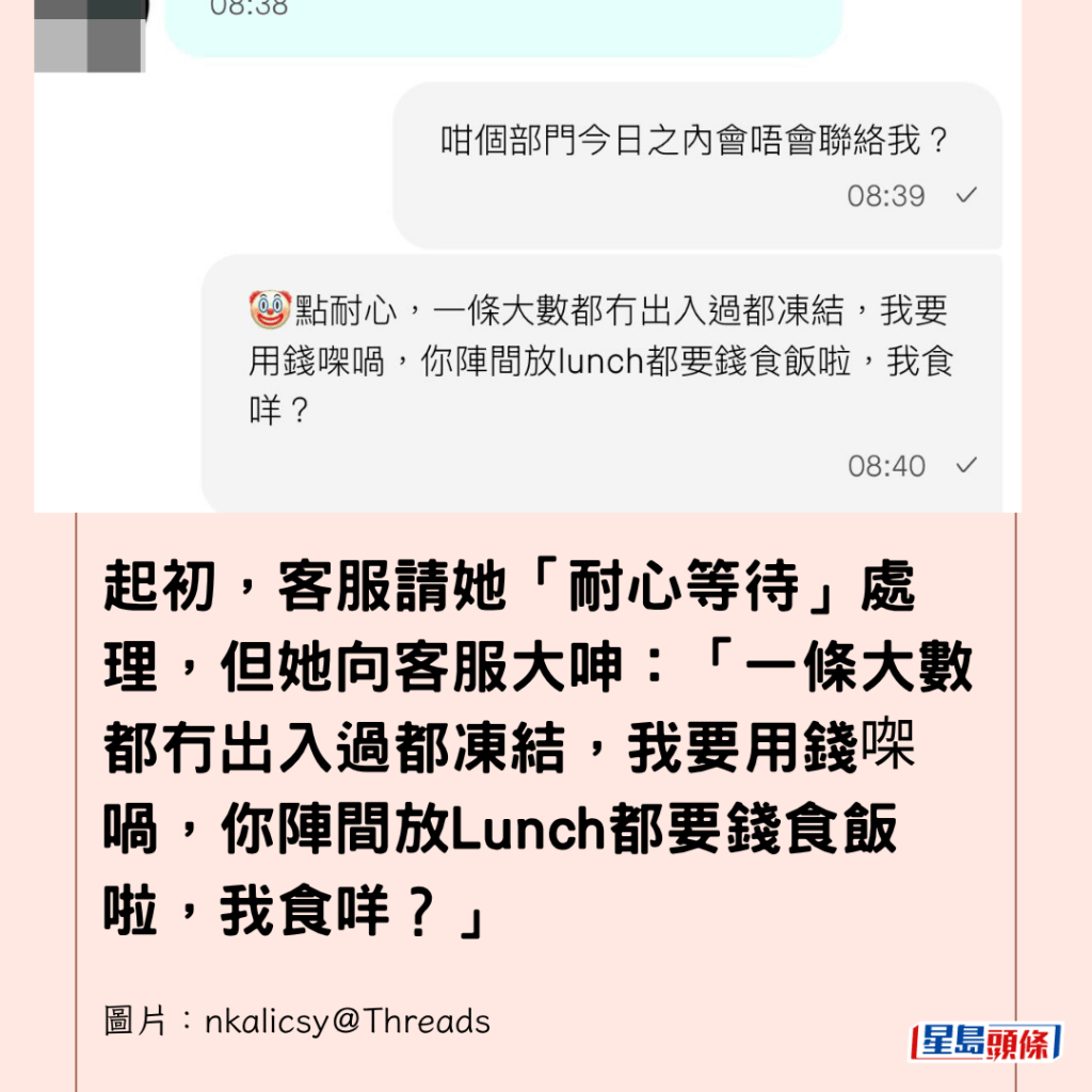 起初,客服請她「耐心等待」處理,但她向客服大呻:「一條大數都冇出入過都凍結,我要用錢㗎喎,你陣間放Lunch都要錢食飯啦,我食咩?」
