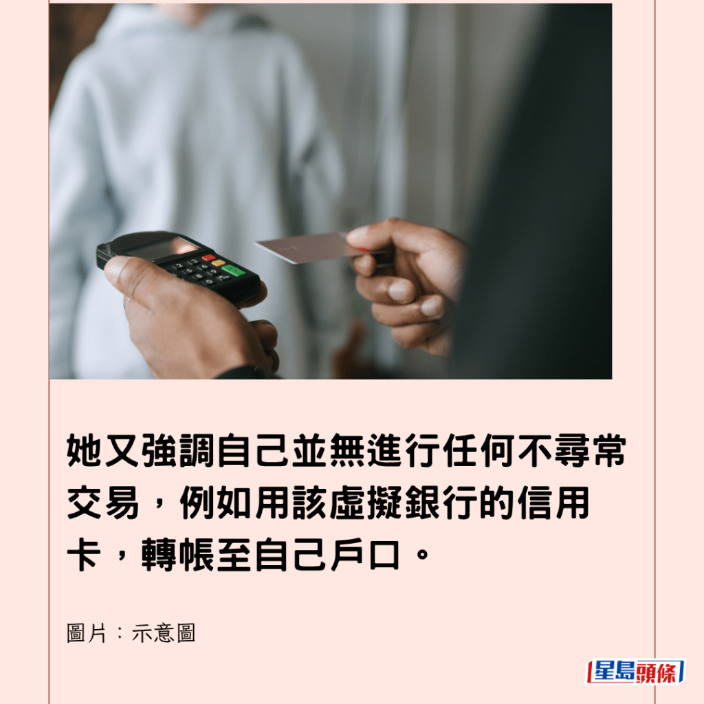 她又強調自己並無進行任何不尋常交易,例如用該虛擬銀行的信用卡,轉帳至自己戶口。