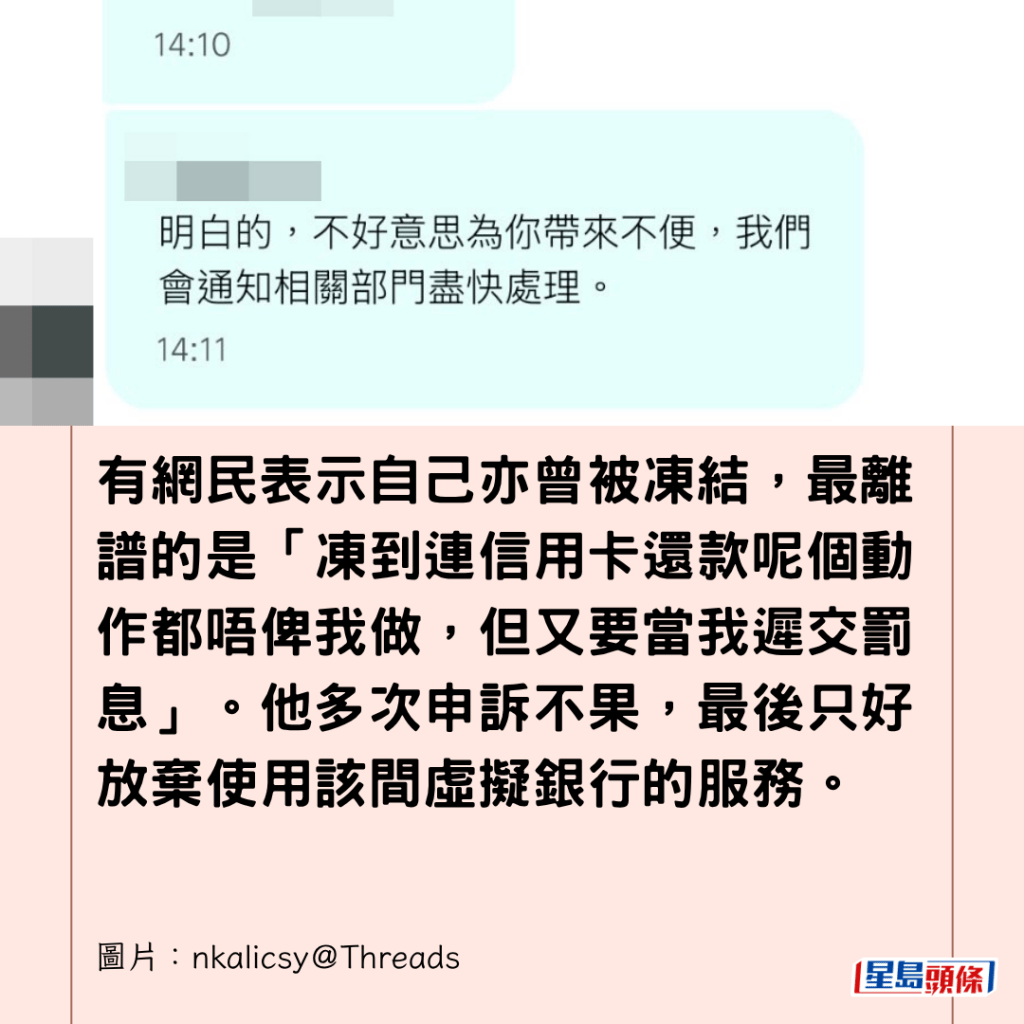 有網民表示自己亦曾被凍結,最離譜的是「凍到連信用卡還款呢個動作都唔俾我做,但又要當我遲交罰息」。他多次申訴不果,最後只好放棄使用該間虛擬銀行的服務。