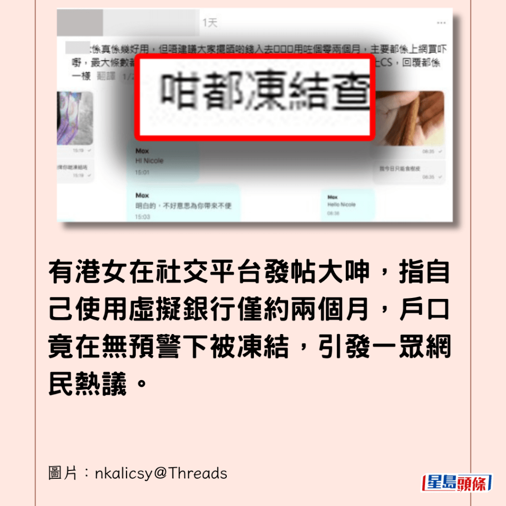 有港女近日在社交平台發帖大呻,指自己使用虛擬銀行僅約兩個月,戶口竟在無預警下被凍結,引發一眾網民熱議。