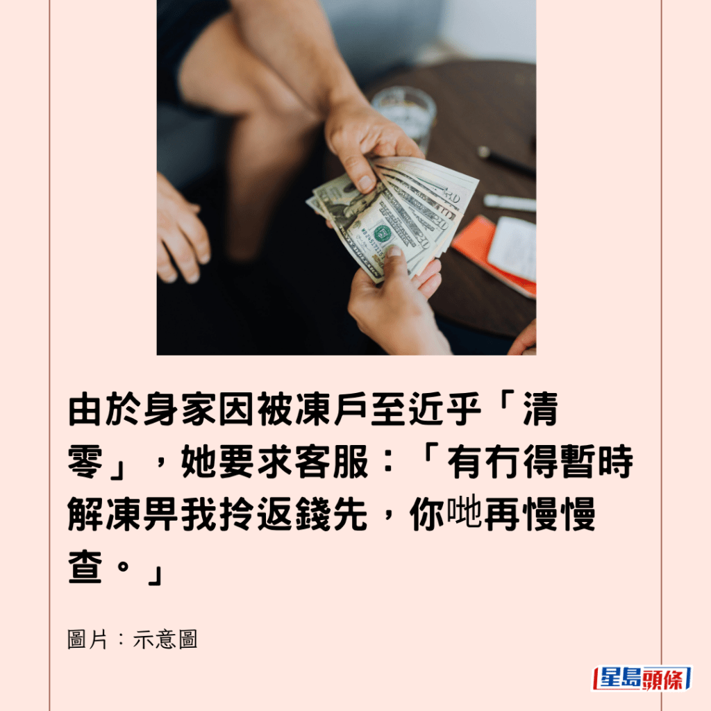 由於身家因被凍戶至近乎「清零」,她要求客服:「有冇得暫時解凍畀我拎返錢先,你哋再慢慢查。」客服則指這是「內部流程」,由於當時為早上8時多「未到部門的上班時間」,因此客服請她兩小時後再聯絡。