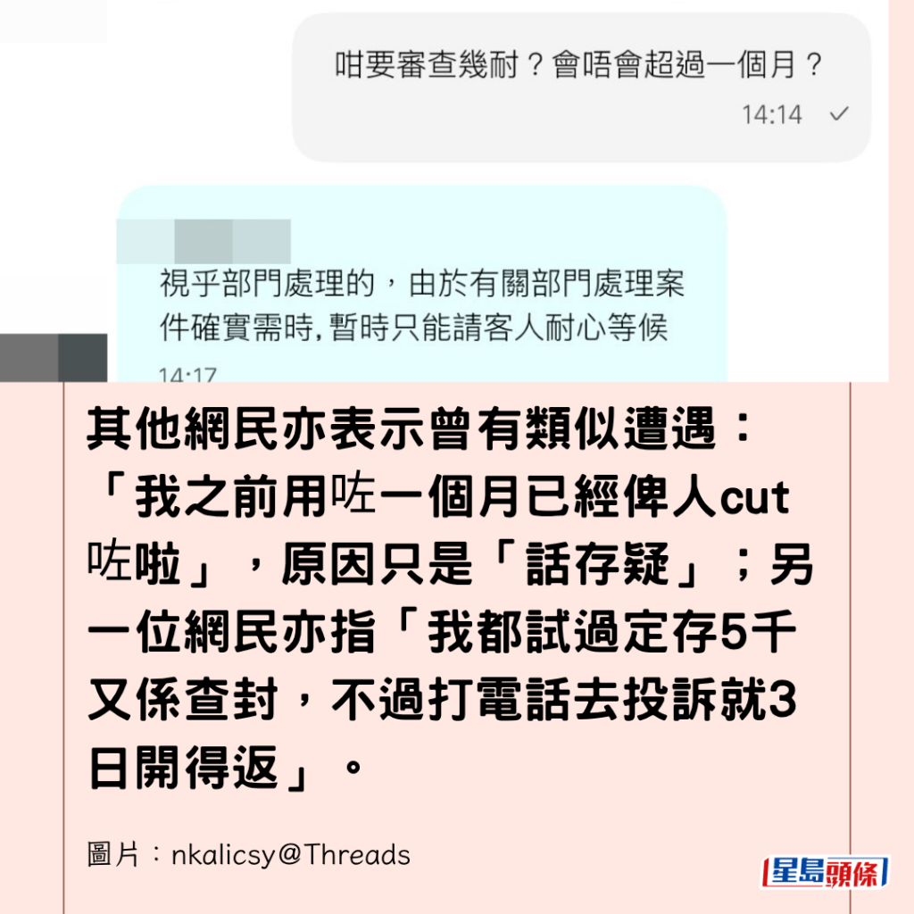 其他網民亦表示曾有類似遭遇:「我之前用咗一個月已經俾人cut咗啦」,原因只是「話存疑」;另一位網民亦指「我都試過定存5千又係查封,不過打電話去投訴就3日開得返」。