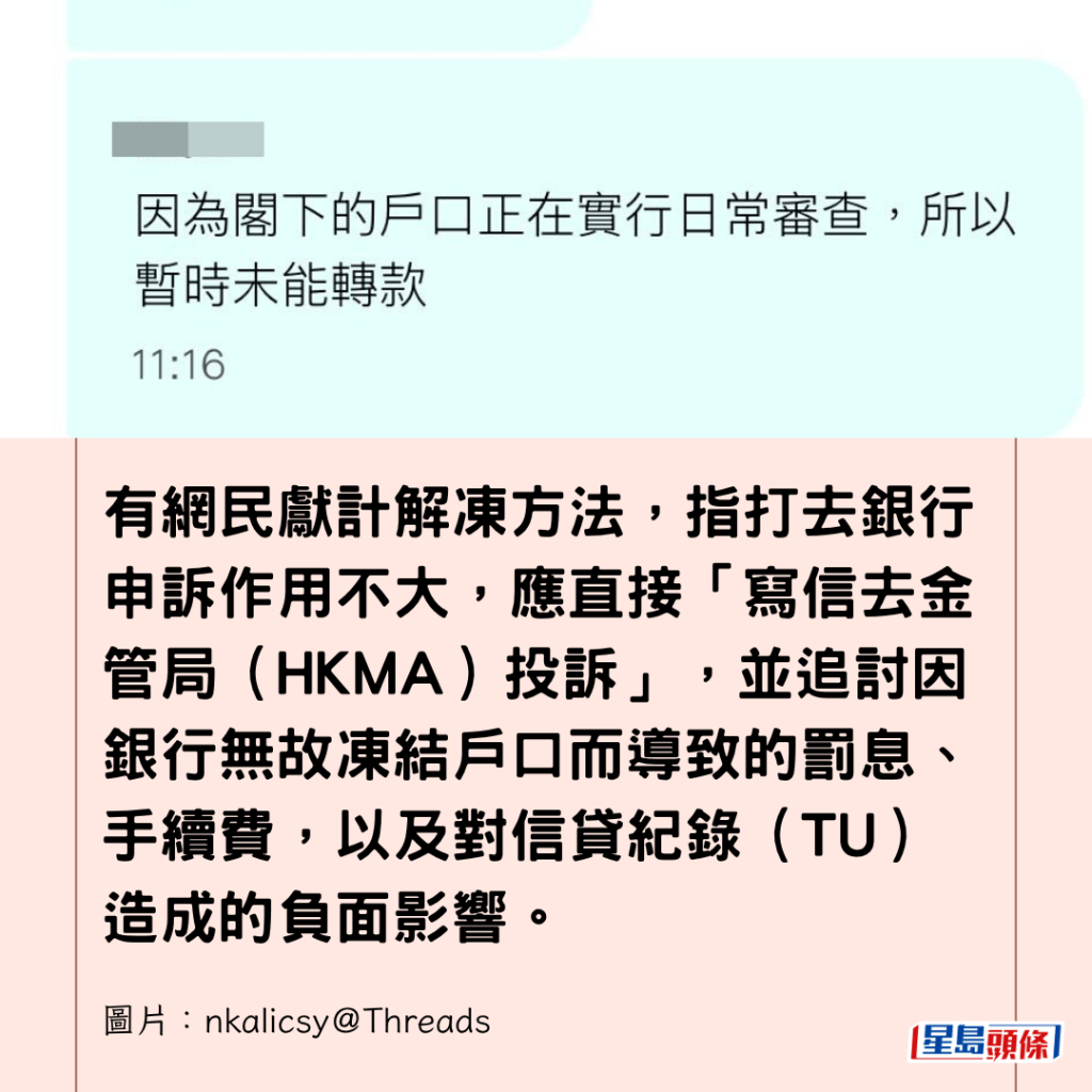 有網民獻計解凍方法,指打去銀行申訴作用不大,應直接「寫信去金管局(HKMA)投訴」,並追討因銀行無故凍結戶口而導致的罰息、手續費,以及對信貸紀錄(TU)造成的負面影響。