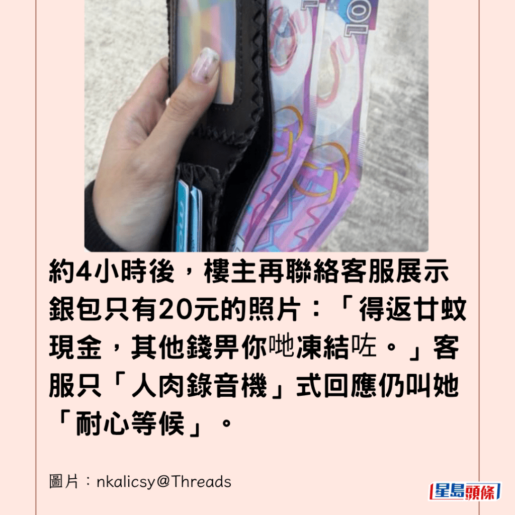 約4小時後,樓主再聯絡客服展示銀包只有20元的照片:「得返廿蚊現金,其他錢畀你哋凍結咗。」客服只「人肉錄音機」式回應仍叫她「耐心等候」。