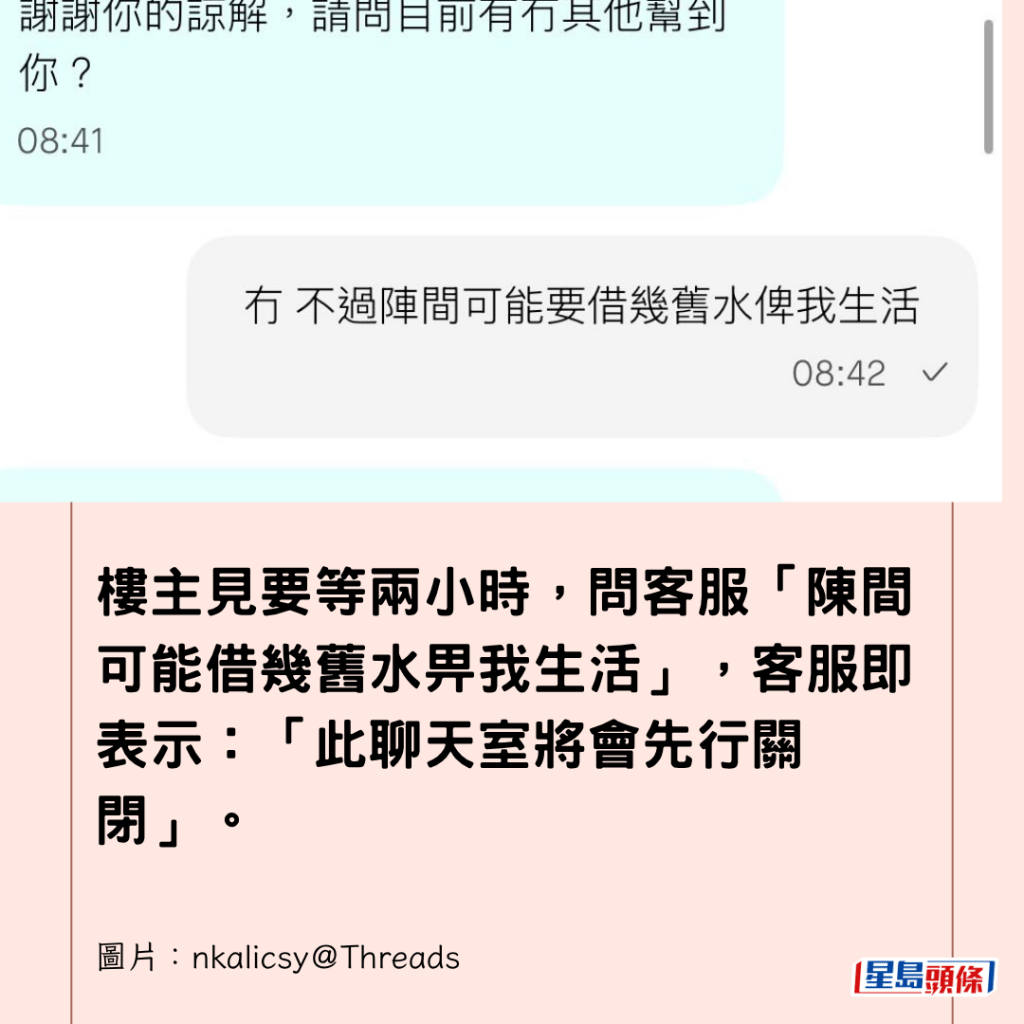 樓主見要等兩小時,問客服「陳間可能借幾舊水畀我生活」,客服即表示:「此聊天室將會先行關閉」。