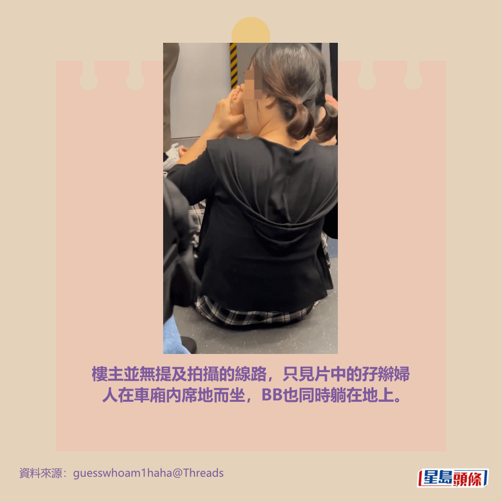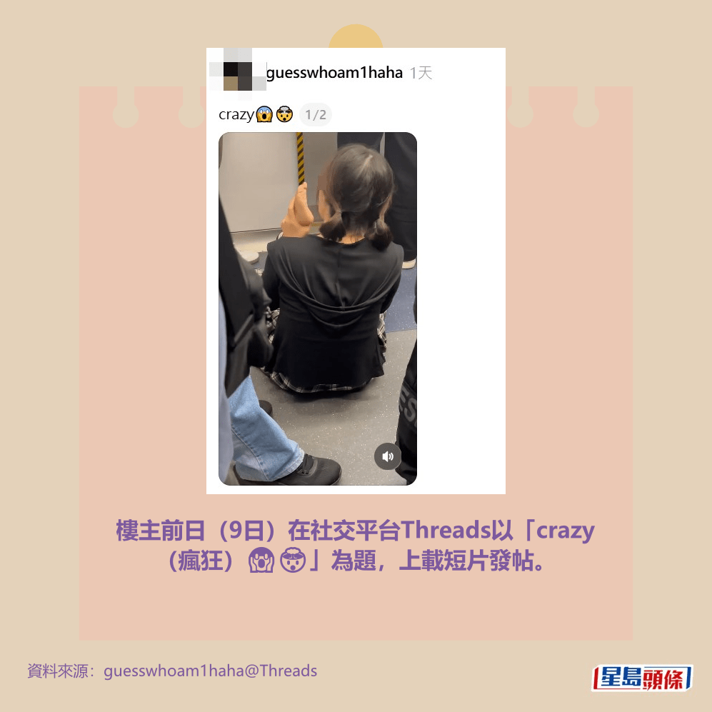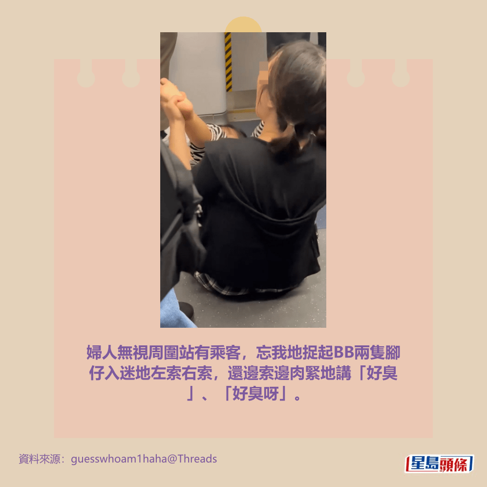 樓主前日(9日)在社交平台Threads以「crazy(瘋狂)😱🤯」為題,上載短片發帖。樓主並無提及拍攝的線路,只見片中的孖辮婦人在車廂內席地而坐,BB也同時躺在地上。婦人無視周圍站有乘客,忘我地捉起BB兩隻腳仔入迷地左索右索,還邊索邊肉緊地講「好臭」、「好臭呀」。