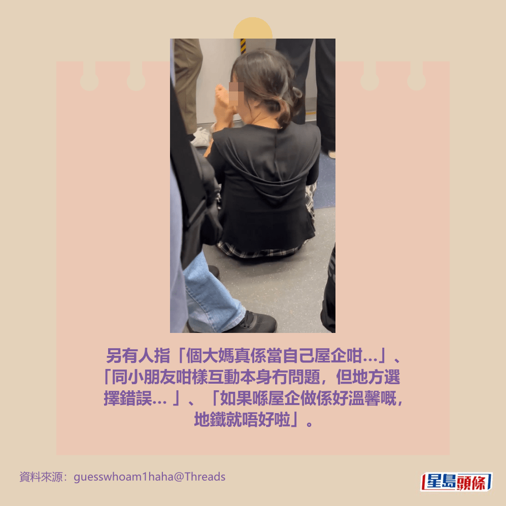 網民回應時也批評孖辮婦人的自私做法,力斥「的確好黐線!只係諗到我遇到呢啲情況可以點做!睇嚟都只能夠行開」、「個大媽真係當自己屋企咁…」、「同小朋友咁樣互動本身冇問題,但地方選擇錯誤… 」、「如果喺屋企做係好溫馨嘅,地鐵就唔好啦」。