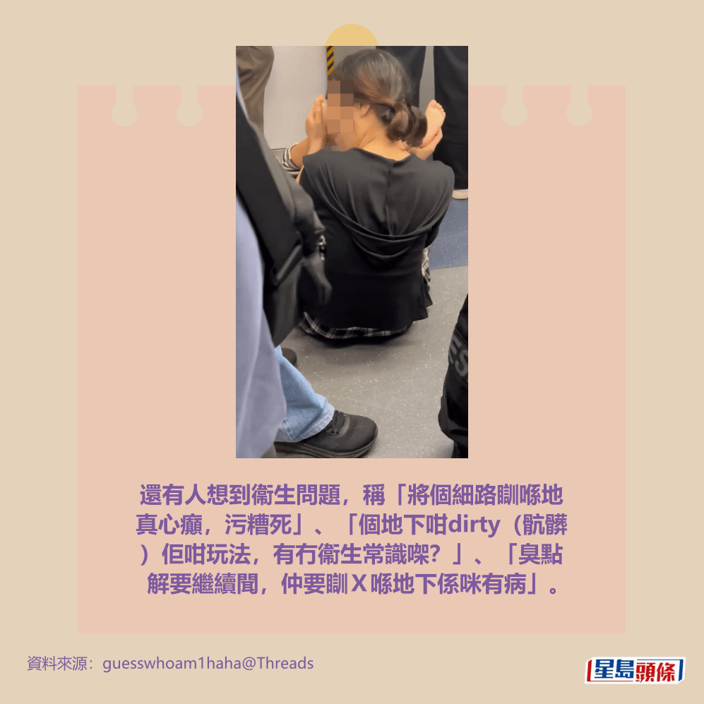 還有人想到衞生問題,稱「將個細路瞓喺地真心癲,污糟死」、「個地下咁dirty(骯髒)佢咁玩法,有冇衞生常識㗎?」、「臭點解要繼續聞,仲要瞓X喺地下係咪有病」。