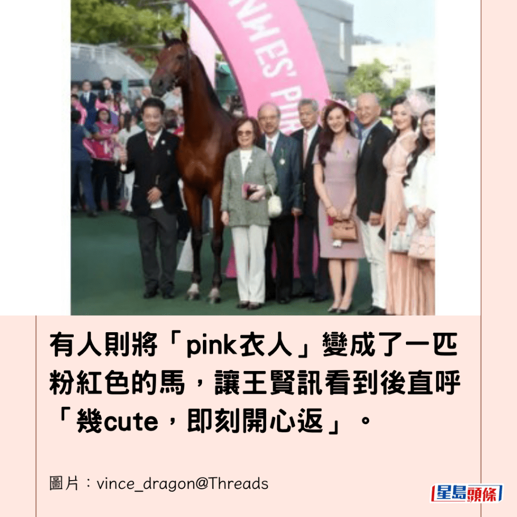 有人則將「pink衣人」變成了一匹粉紅色的馬,讓王賢訊看到後直呼「幾cute,即刻開心返」。