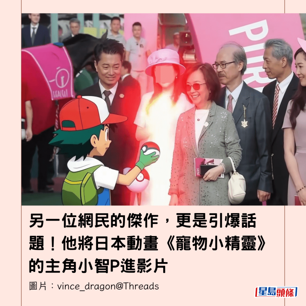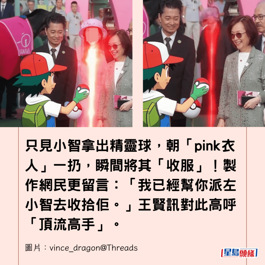 另一位網民的傑作,更是引爆話題!他將日本動畫《寵物小精靈》的主角小智P進影片,只見小智拿出精靈球,朝「pink衣人」一扔,瞬間將其「收服」!製作網民更留言:「我已經幫你派左小智去收拾佢。」王賢訊對此高呼「頂流高手」。