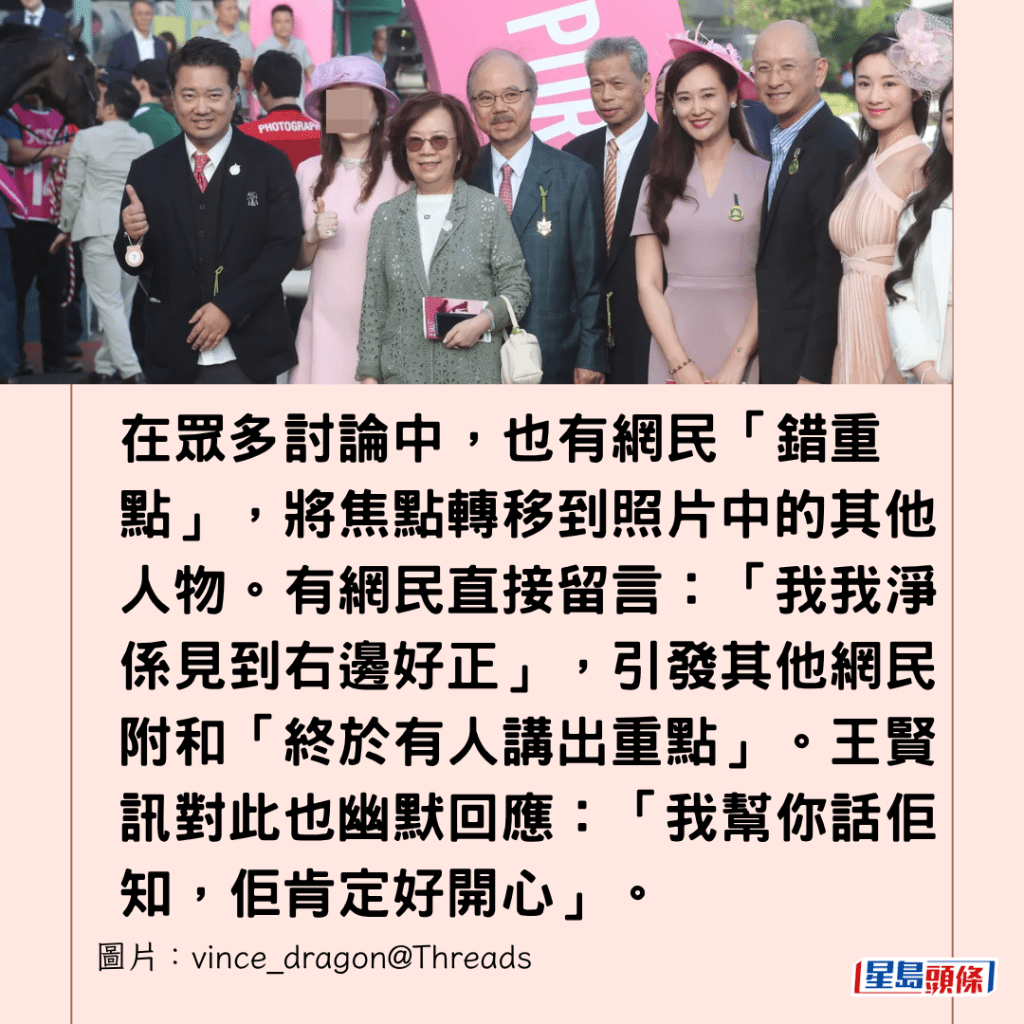 在眾多討論中,也有網民「錯重點」,將焦點轉移到照片中的其他人物。有網民直接留言:「我我淨係見到右邊好正」,引發其他網民附和「終於有人講出重點」。王賢訊對此也幽默回應:「我幫你話佢知,佢肯定好開心」。