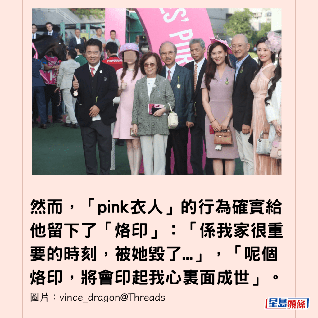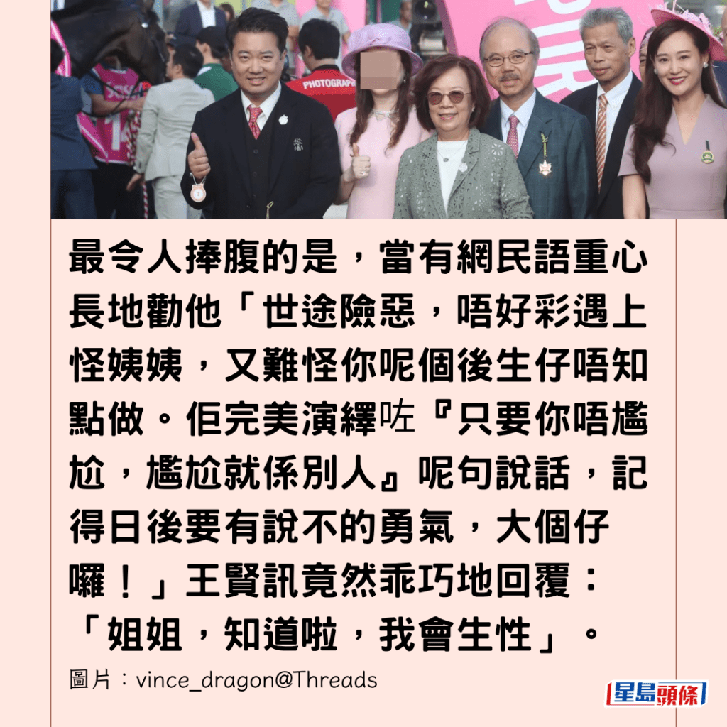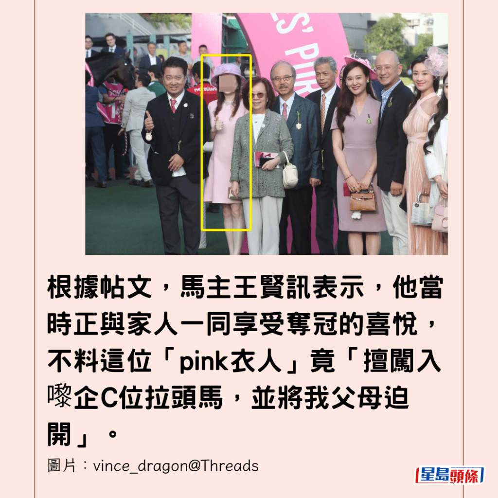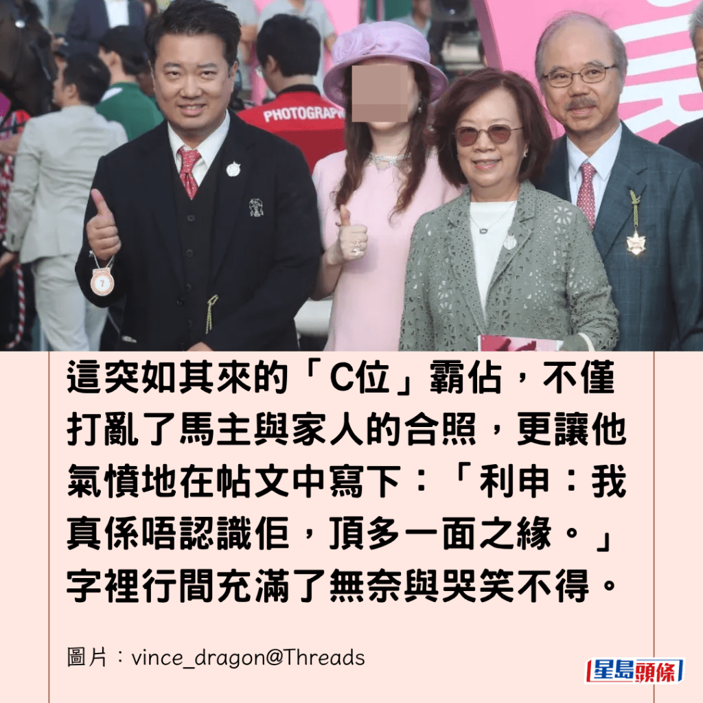 根據帖文,馬主王賢訊表示,他當時正與家人一同享受奪冠的喜悅,不料這位「pink衣人」竟「擅闖入嚟企C位拉頭馬,並將我父母迫開」。這突如其來的「C位」霸佔,不僅打亂了馬主與家人的合照,更讓他氣憤地在帖文中寫下:「利申:我真係唔認識佢,頂多一面之緣。」字裡行間充滿了無奈與哭笑不得。