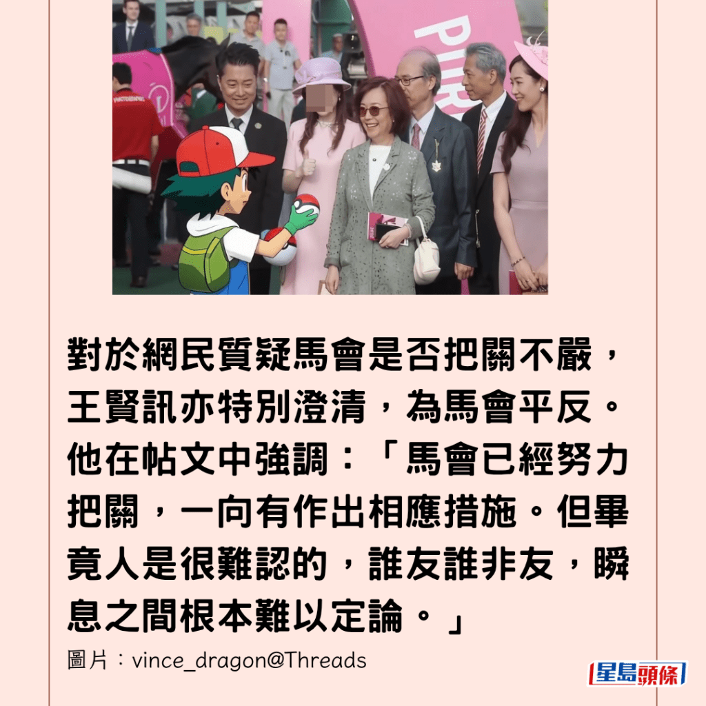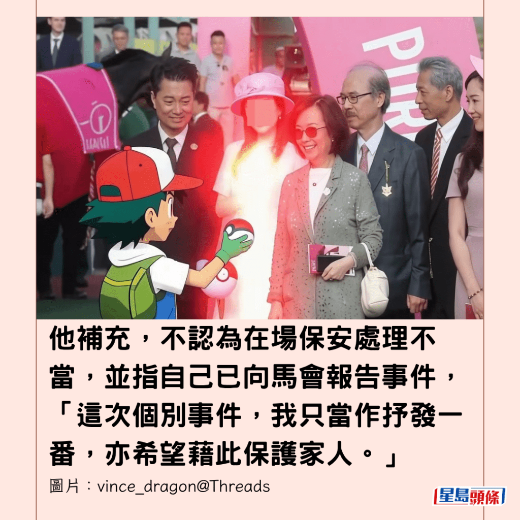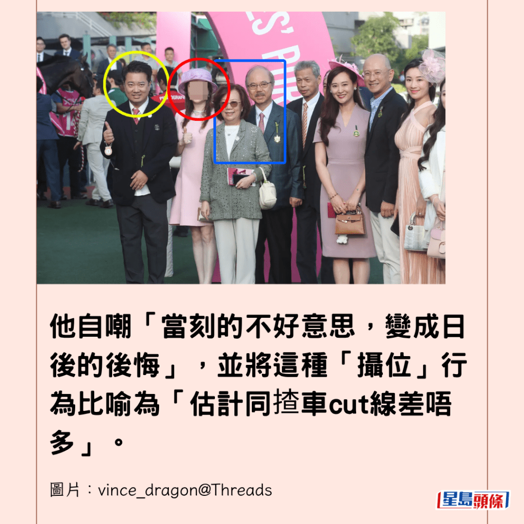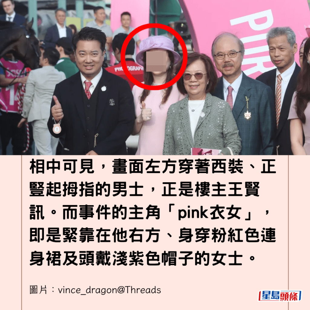 根據帖文,馬主王賢訊表示,他當時正與家人一同享受奪冠的喜悅,不料這位「pink衣人」竟「擅闖入嚟企C位拉頭馬,並將我父母迫開」。這突如其來的「C位」霸佔,不僅打亂了馬主與家人的合照,更讓他氣憤地在帖文中寫下:「利申:我真係唔認識佢,頂多一面之緣。」字裡行間充滿了無奈與哭笑不得。