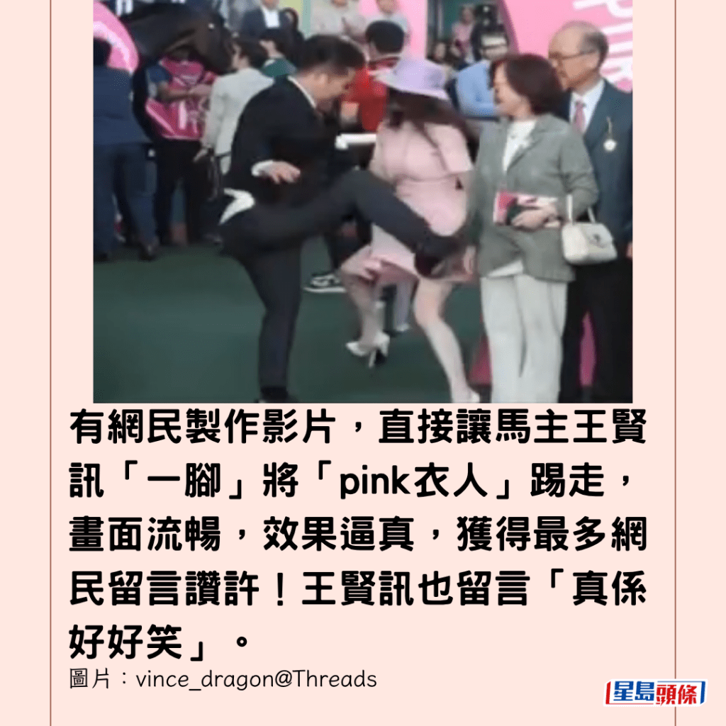 有網民製作影片,直接讓馬主王賢訊「一腳」將「pink衣人」踢走,畫面流暢,效果逼真,獲得最多網民留言讚許!王賢訊也留言「真係好好笑」。