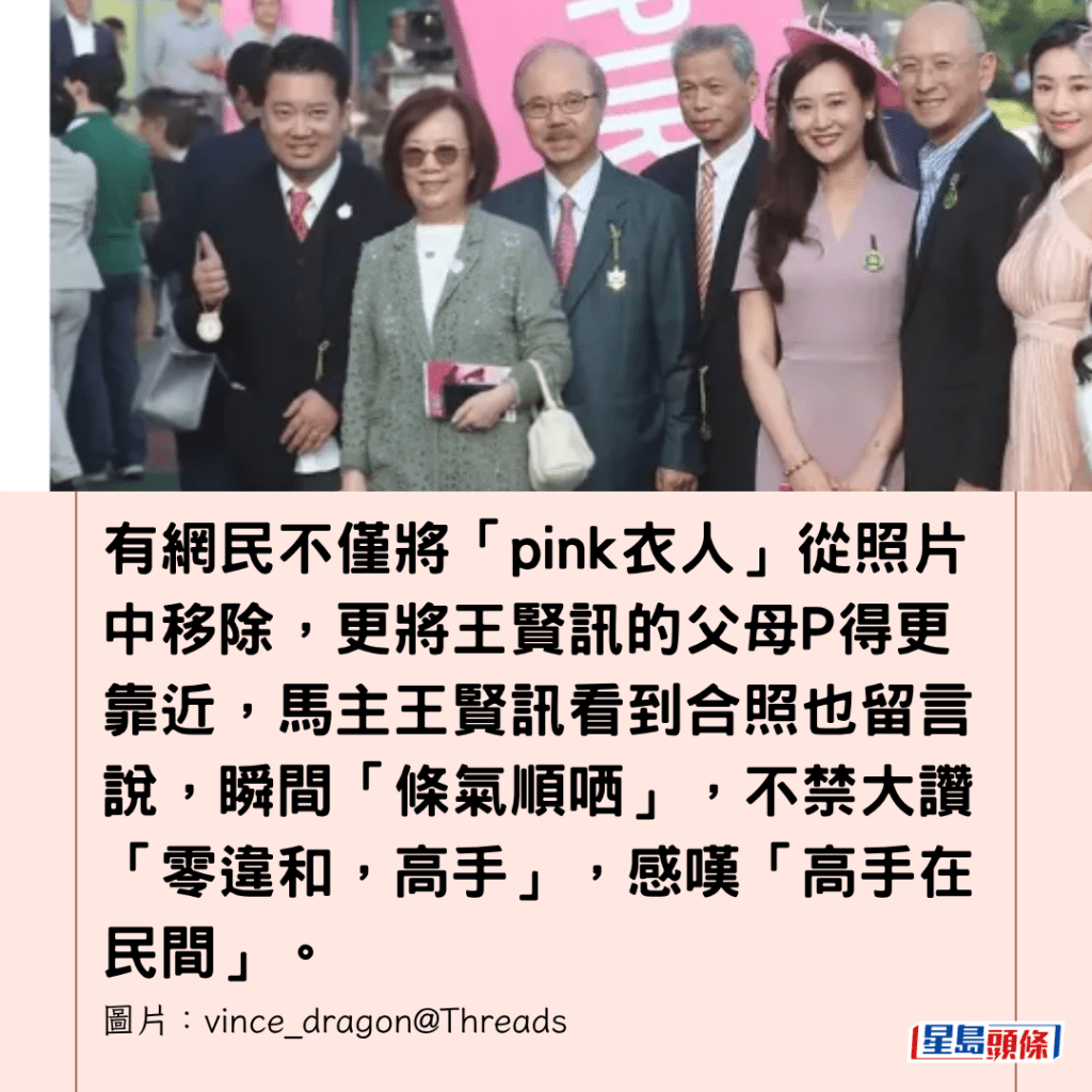 有網民不僅將「pink衣人」從照片中移除,更將王賢訊的父母P得更靠近,馬主王賢訊看到合照也留言說,瞬間「條氣順哂」,不禁大讚「零違和,高手」,感嘆「高手在民間」。