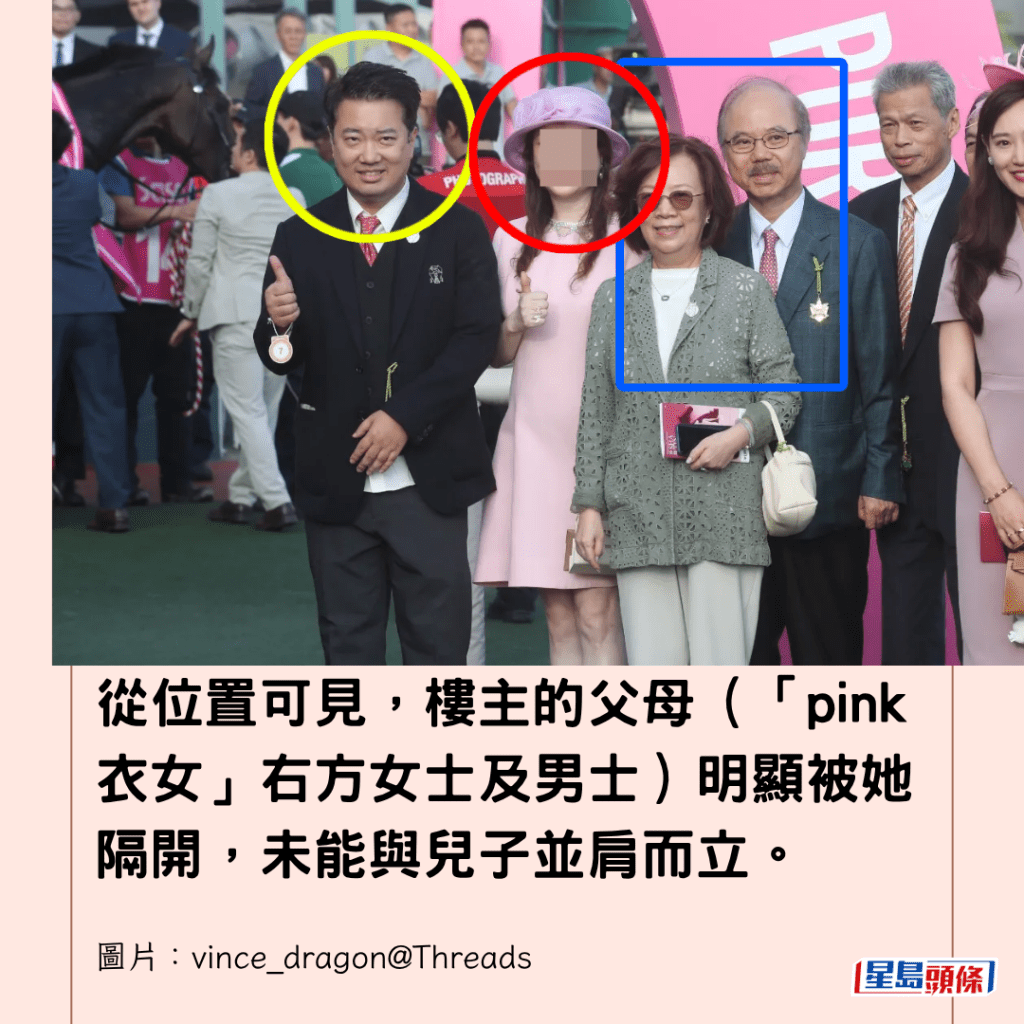 相中可見,畫面左方穿著西裝、正豎起拇指的男士,正是樓主王賢訊。而事件的主角「pink衣女」,即是緊靠在他右方、身穿粉紅色連身裙及頭戴淺紫色帽子的女士。從位置可見,樓主的父母(「pink衣女」右方女士及男士)明顯被她隔開,未能與兒子並肩而立。