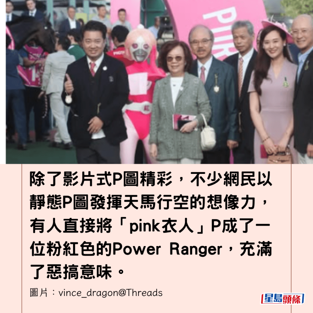除了影片式P圖精彩,不少網民以靜態P圖發揮天馬行空的想像力,有人直接將「pink衣人」P成了一位粉紅色的Power Ranger,充滿了惡搞意味。