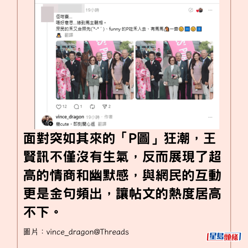 面對突如其來的「P圖」狂潮,王賢訊不僅沒有生氣,反而展現了超高的情商和幽默感,與網民的互動更是金句頻出,讓帖文的熱度居高不下。