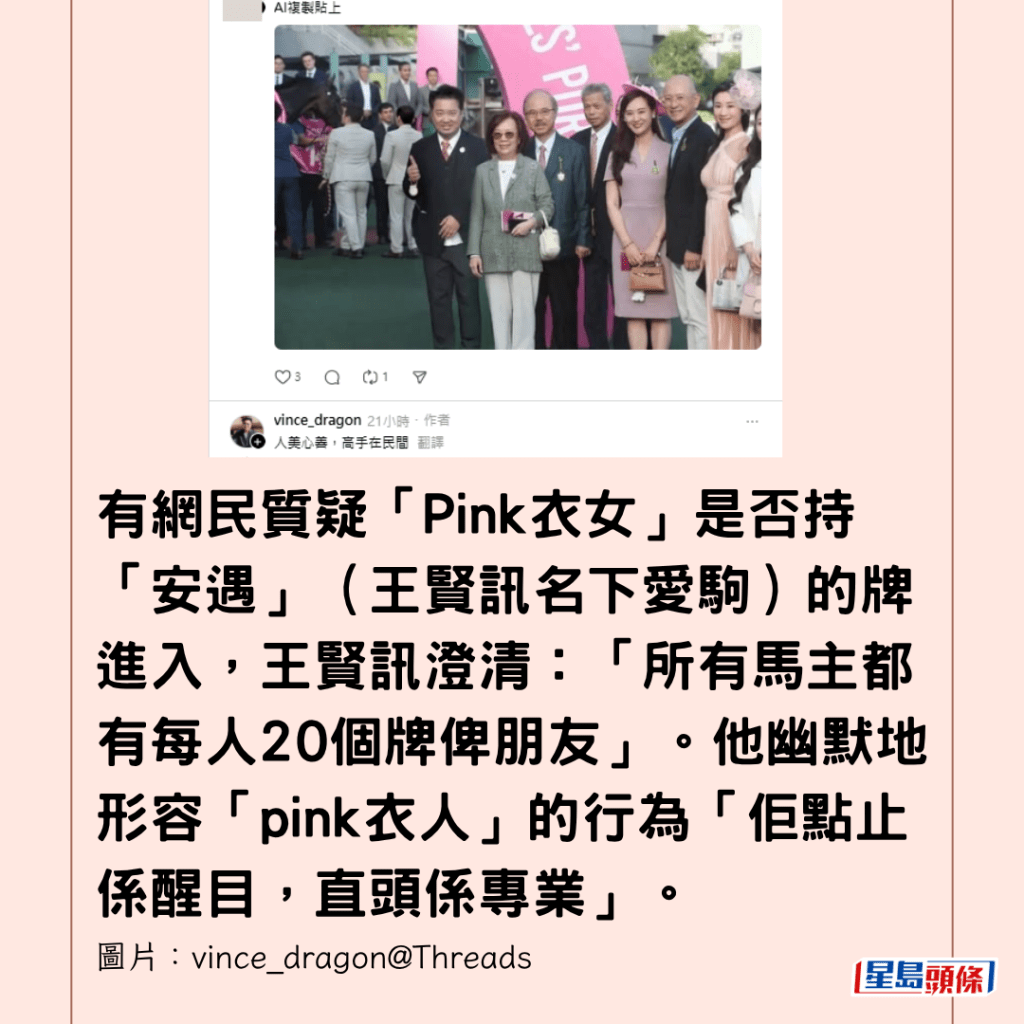 有網民質疑「Pink衣女」是否持「安遇」(王賢訊名下愛駒)的牌進入,王賢訊澄清:「所有馬主都有每人20個牌俾朋友」。他幽默地形容「pink衣人」的行為「佢點止係醒目,直頭係專業」。
