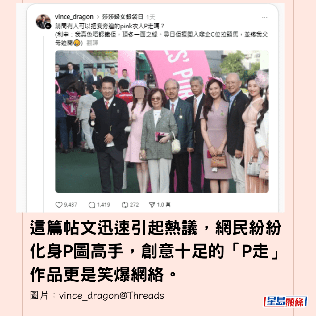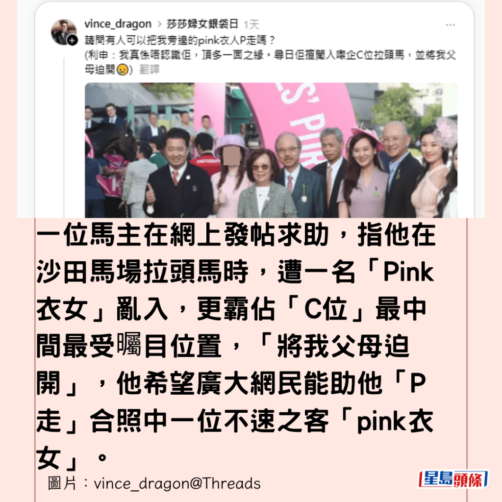 一位馬主在網上發帖求助,指他在沙田馬場拉頭馬時,遭一名「Pink衣女」亂入,更霸佔「C位」最中間最受曯目位置,「將我父母迫開」,他希望廣大網民能助他「P走」合照中一位不速之客「pink衣女」。