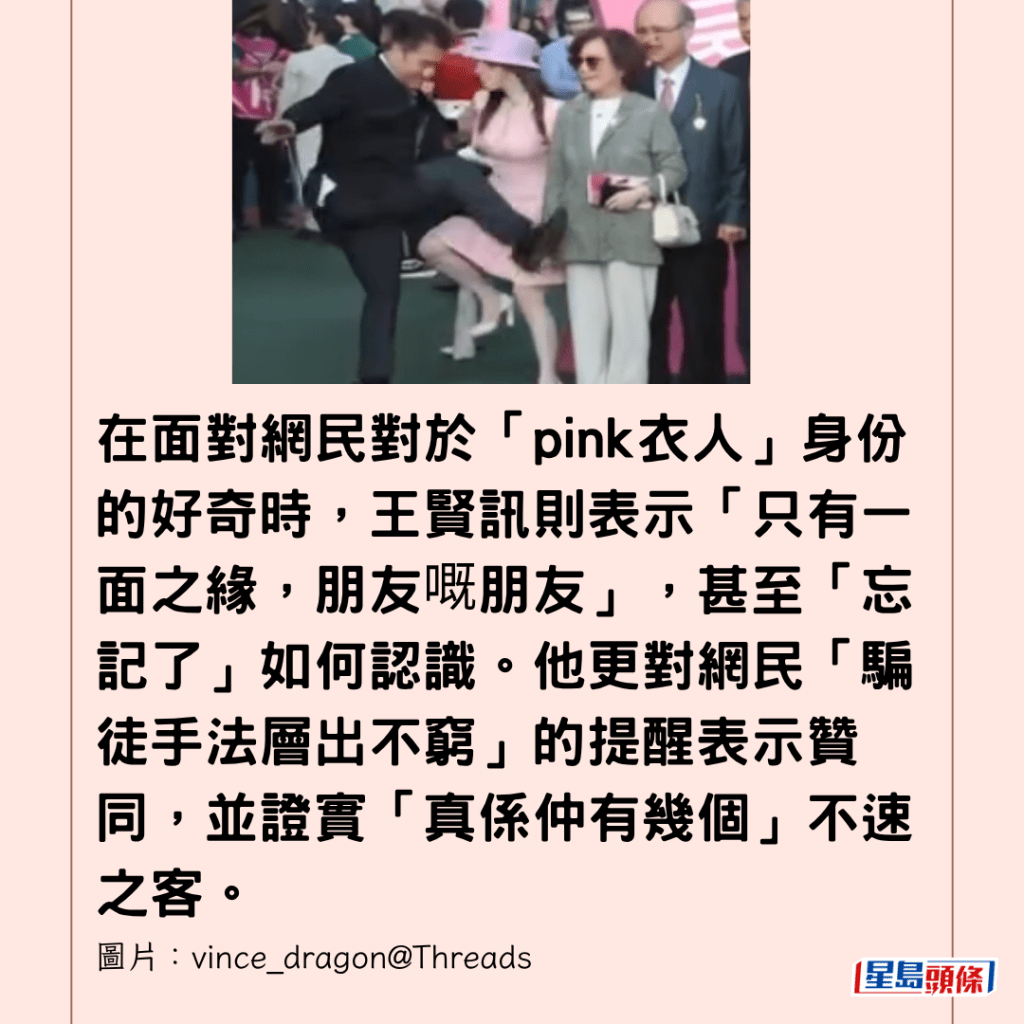 在面對網民對於「pink衣人」身份的好奇時,王賢訊則表示「只有一面之緣,朋友嘅朋友」,甚至「忘記了」如何認識。他更對網民「騙徒手法層出不窮」的提醒表示贊同,並證實「真係仲有幾個」不速之客。