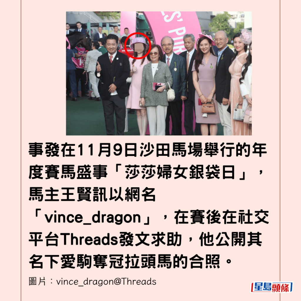 事發在11月9日沙田馬場舉行的年度賽馬盛事「莎莎婦女銀袋日」,馬主王賢訊以網名「vince_dragon」,在賽後在社交平台Threads發文求助,他公開其名下愛駒奪冠拉頭馬的合照。