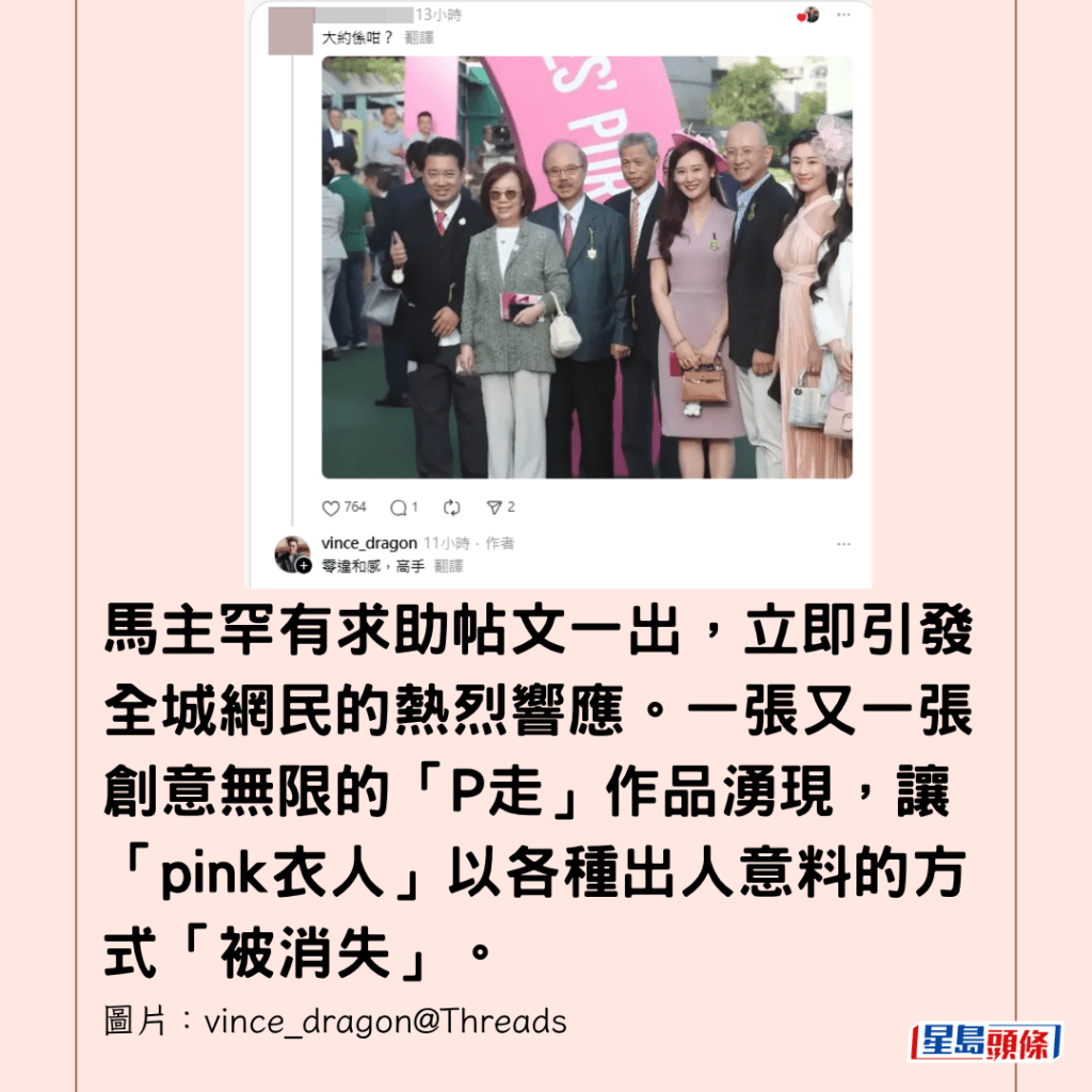 馬主罕有求助帖文一出,立即引發全城網民的熱烈響應。一張又一張創意無限的「P走」作品湧現,讓「pink衣人」以各種出人意料的方式「被消失」。