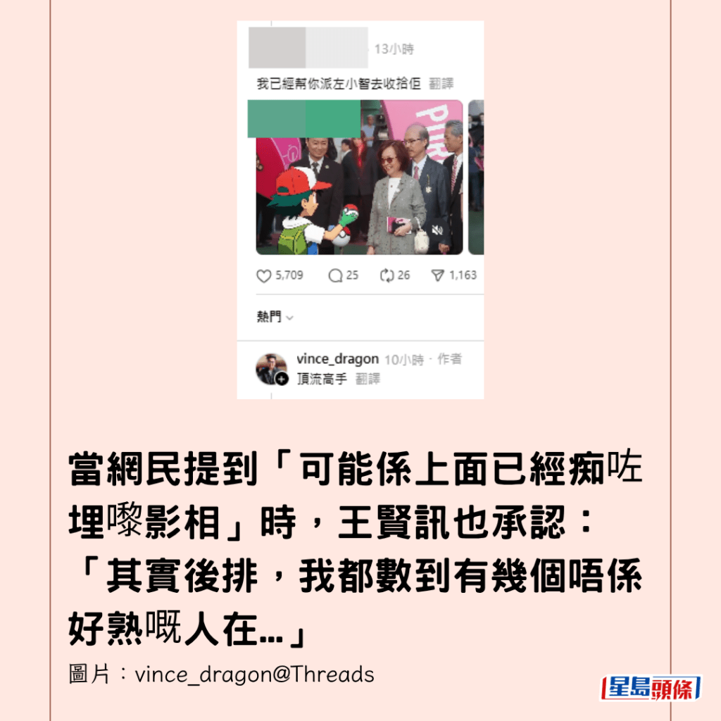 當網民提到「可能係上面已經痴咗埋嚟影相」時,王賢訊也承認:「其實後排,我都數到有幾個唔係好熟嘅人在…」