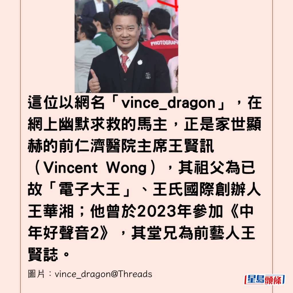 這位以網名「vince_dragon」,在網上幽默求救的馬主,正是家世顯赫的前仁濟醫院主席王賢訊(Vincent Wong),其祖父為已故「電子大王」、王氏國際創辦人王華湘;他曾於2023年參加《中年好聲音2》,其堂兄為前藝人王賢誌。