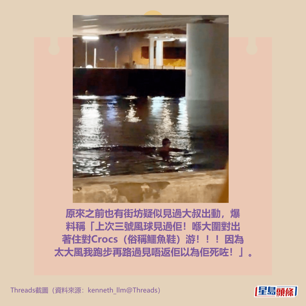 原來之前也有街坊疑似見過大叔出動,爆料稱「上次三號風球見過佢!喺大圍對出著住對Crocs(俗稱鱷魚鞋)游!!!因為太大風我跑步再路過見唔返佢以為佢死咗!」。