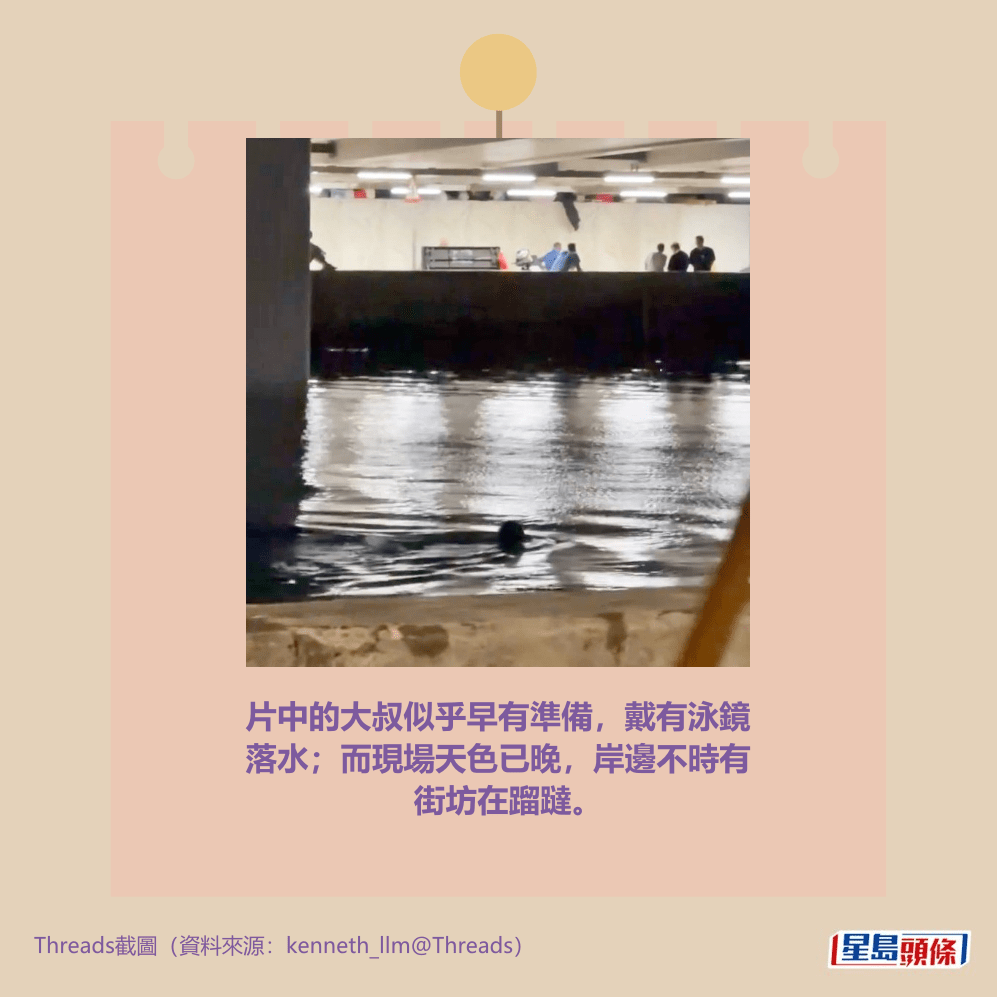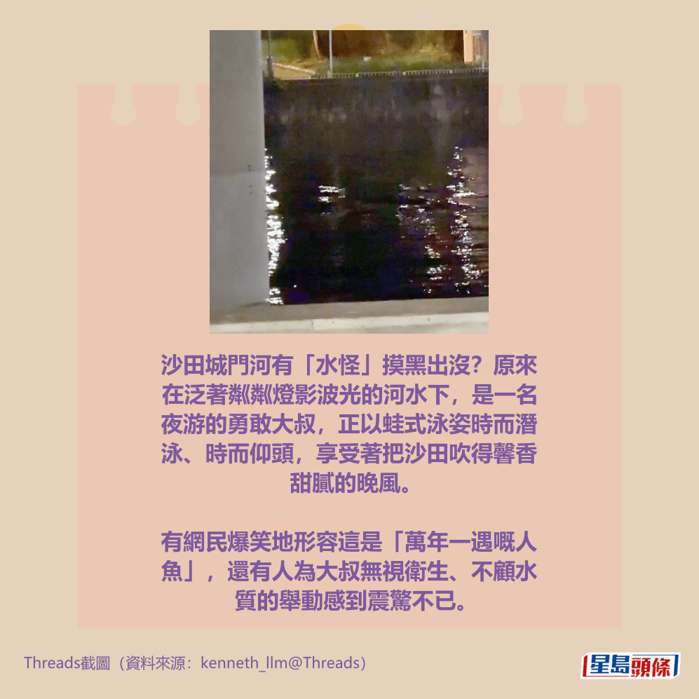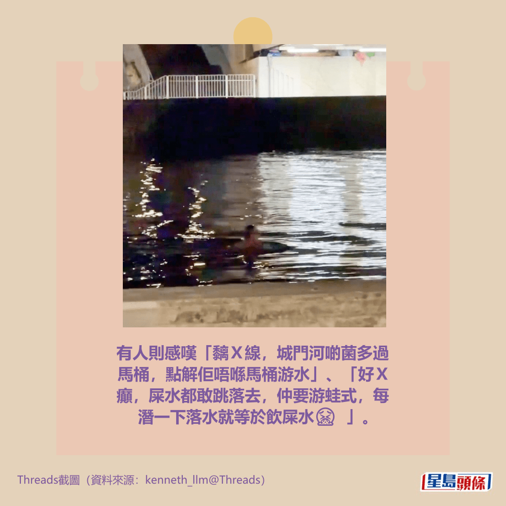 樓主本月9日在社交平台Threads以「城門河」為題上載短片發帖,指「跑跑下步以為見到條大魚,原來有人喺度暢游城門河😂」。片中的大叔似乎早有準備,戴有泳鏡落水;而現場天色已晚,岸邊不時有街坊在蹓躂。