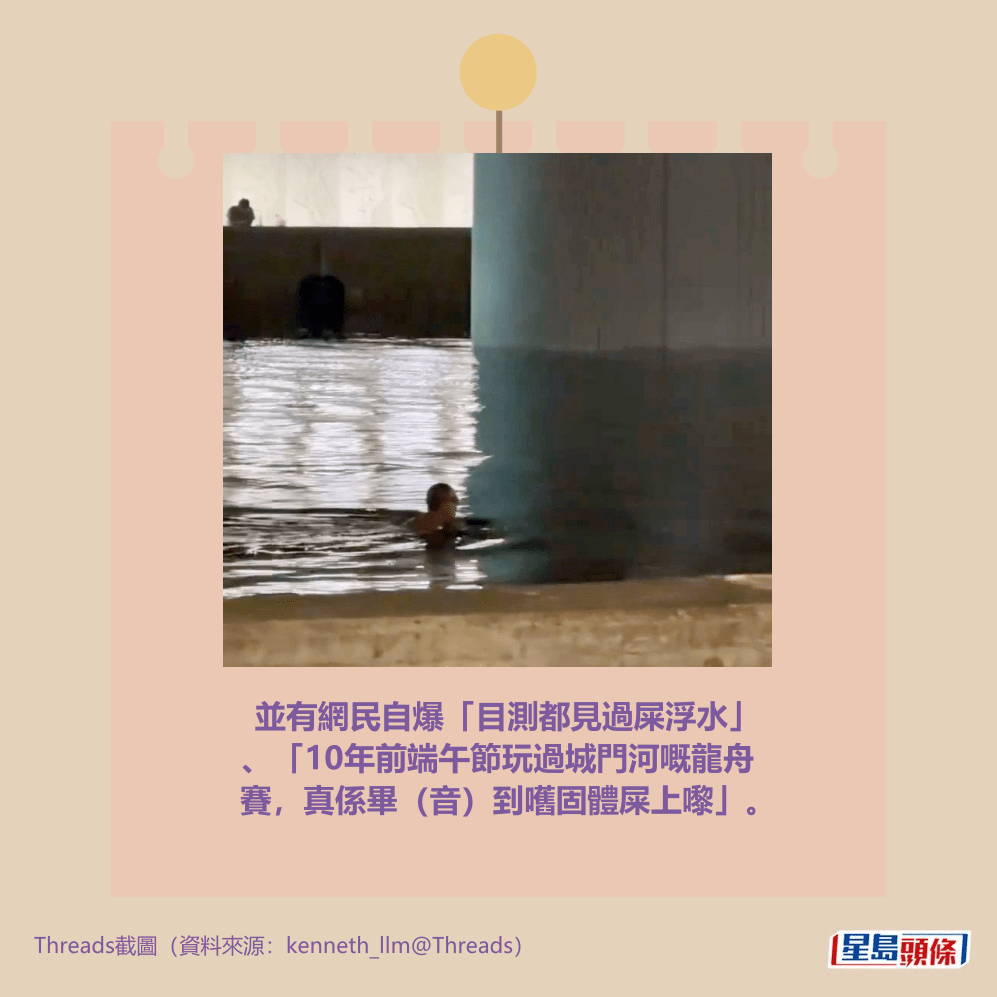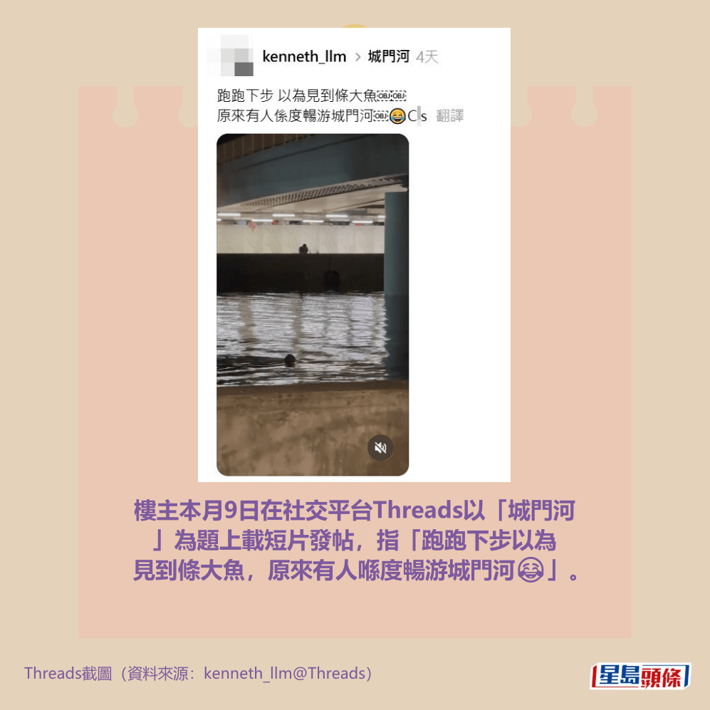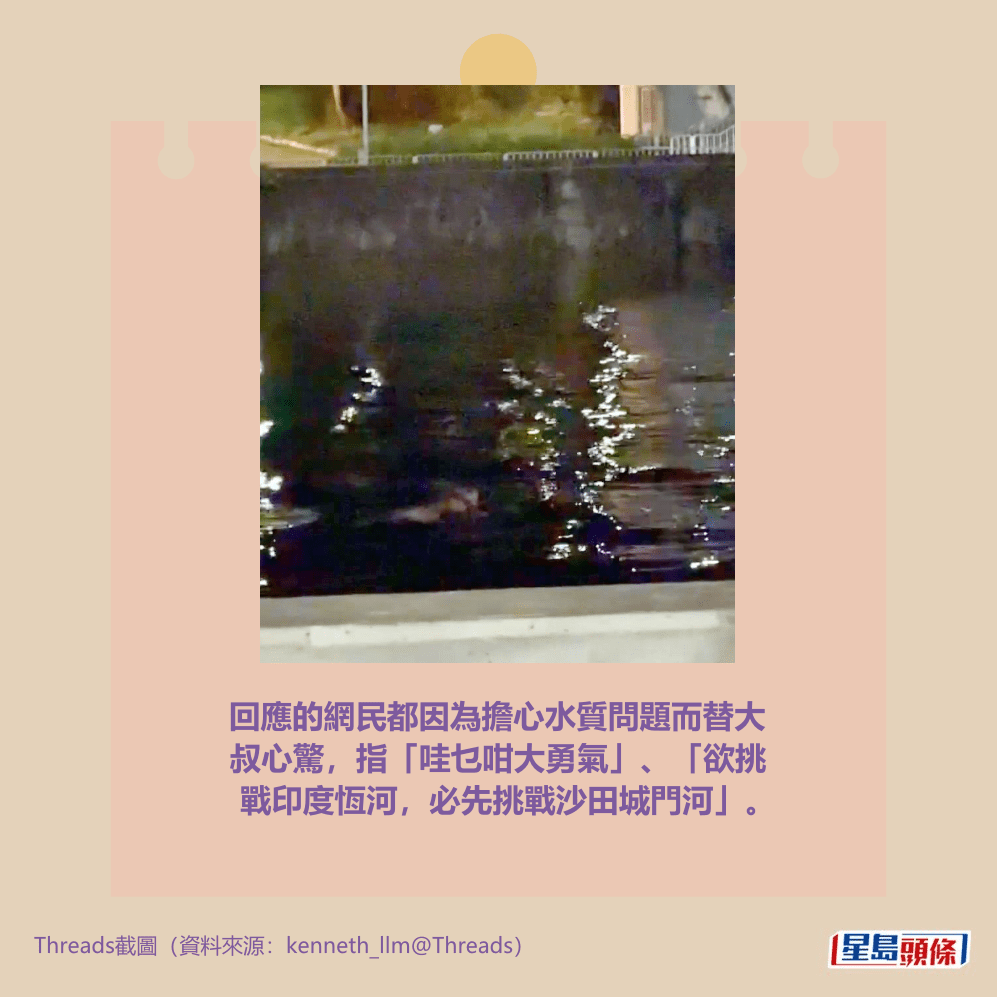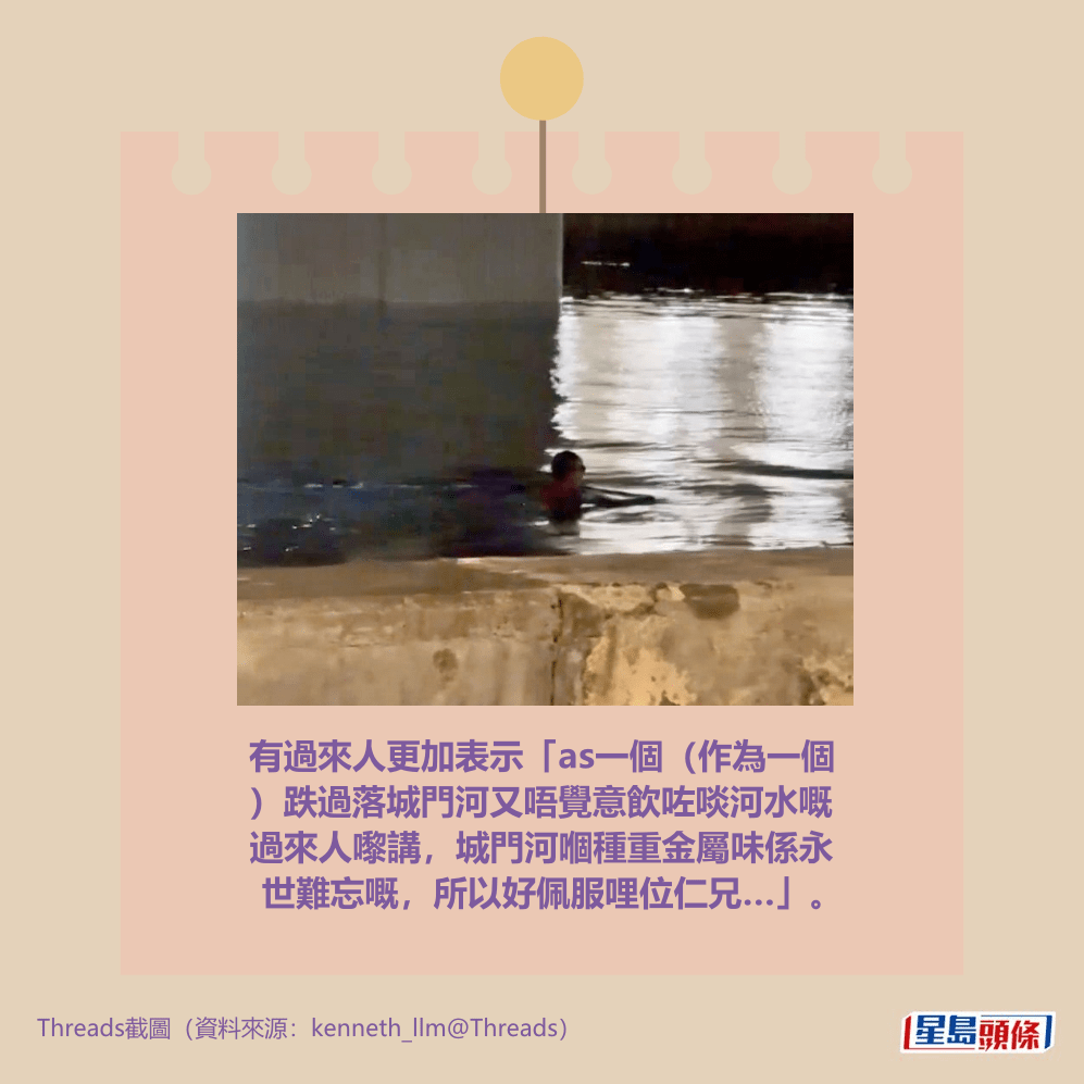 樓主本月9日在社交平台Threads以「城門河」為題上載短片發帖,指「跑跑下步以為見到條大魚,原來有人喺度暢游城門河😂」。片中的大叔似乎早有準備,戴有泳鏡落水;而現場天色已晚,岸邊不時有街坊在蹓躂。