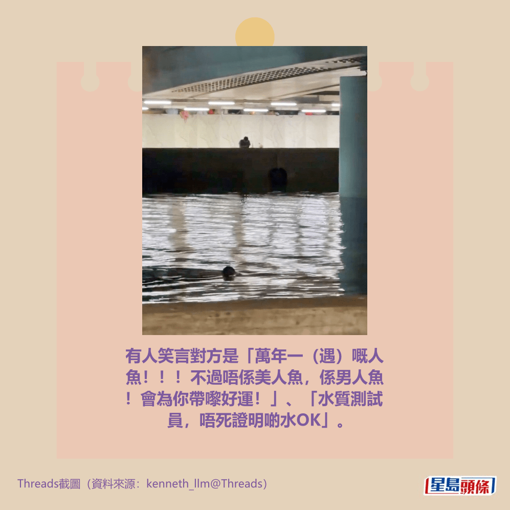 有人笑言對方是「萬年一(遇)嘅人魚!!!不過唔係美人魚,係男人魚!會為你帶嚟好運!」、「水質測試員,唔死證明啲水OK」,並自爆「目測都見過屎浮水」、「10年前端午節玩過城門河嘅龍舟賽,真係𢳂到嚿固體屎上嚟」。