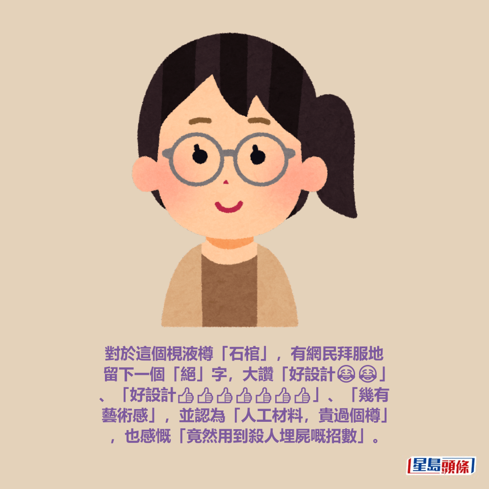 對於這個梘液樽「石棺」,有網民拜服地留下一個「絕」字,大讚「好設計😂😂」、「好設計👍👍👍👍👍👍👍」、「幾有藝術感」,並認為「人工材料,貴過個樽」,也感慨「竟然用到殺人埋屍嘅招數」。