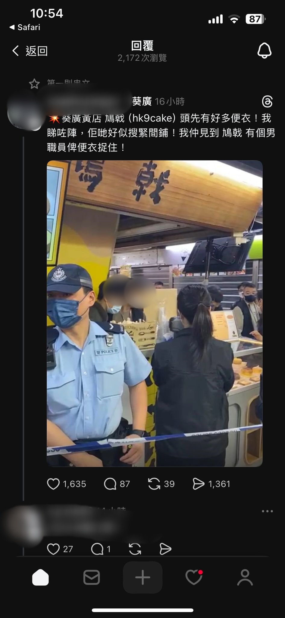 ⾸⾴ 即時港聞 葵涌廣場班戟店被搜 1男子涉煽動罪被捕 2025-11-24 20:09:00 社交平台流傳一個帖文,指葵涌廣場內2樓的一間受食客歡迎的梳乎厘班戟店「鳩戟」,昨日(24日)中午遭警員調查,當中包括便衣探員在店內搜查。發帖人指:「頭先有好多便衣,佢哋好似搜緊間鋪(舖)!我仲見到鳩戟有個男職員俾便衣捉住!」 網上照片所見,軍裝警員用膠帶圍封店舖,同時有便衣探員在附近搜查,一名便衣女警手持攝錄機拍攝調查過程。 消息透露,11月24日中午,一名男子涉煽動罪於葵涌廣場被捕。