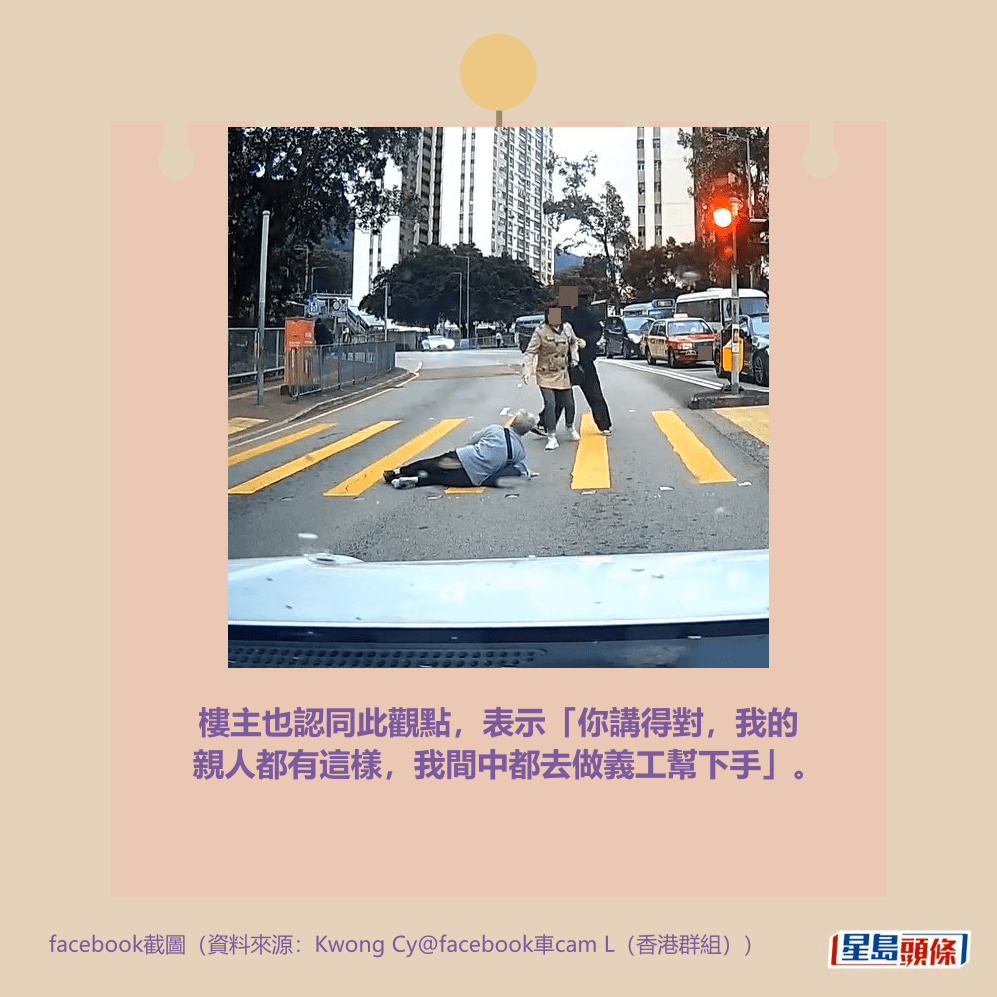 該司機在帖文中附有當時的車cam片截圖,看到一名男子倒卧在馬路旁,他身旁有汽車經過,但未見有人落車施以援手。該司機表示:「啱啱揸車經過,見到伯伯瞓低咗係馬路,都冇人理,即刻幫手停低車叫白車。」
