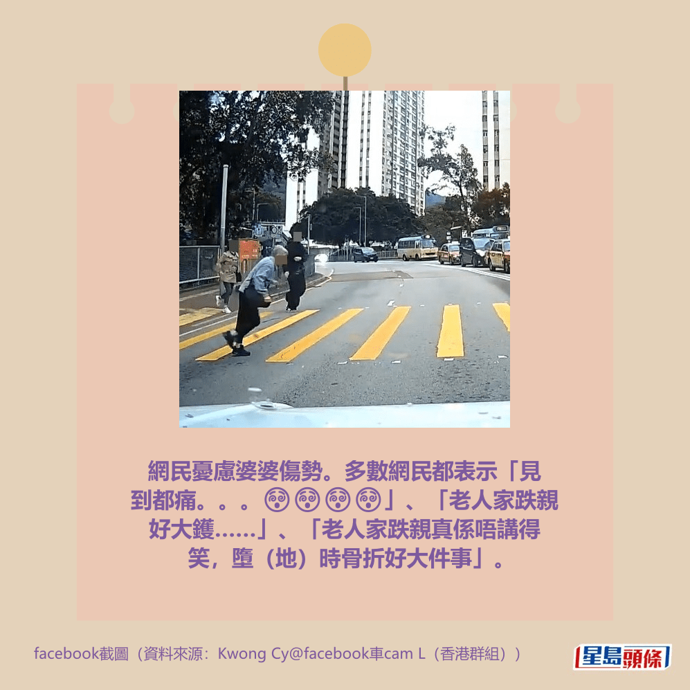 網民憂慮婆婆傷勢。多數網民都表示「見到都痛。。。😵😵😵😵」、「老人家跌親好大鑊……」、「老人家跌親真係唔講得笑,墮(地)時骨折好大件事」。特別是「好似撞到個頭。。。。😣」和「佢膝頭直接撞落地😥🙈😢」等細節,更讓網民擔心婆婆的健康狀況,並建議「呢個老人家最好去醫院檢查下,頭撞地好危險」。